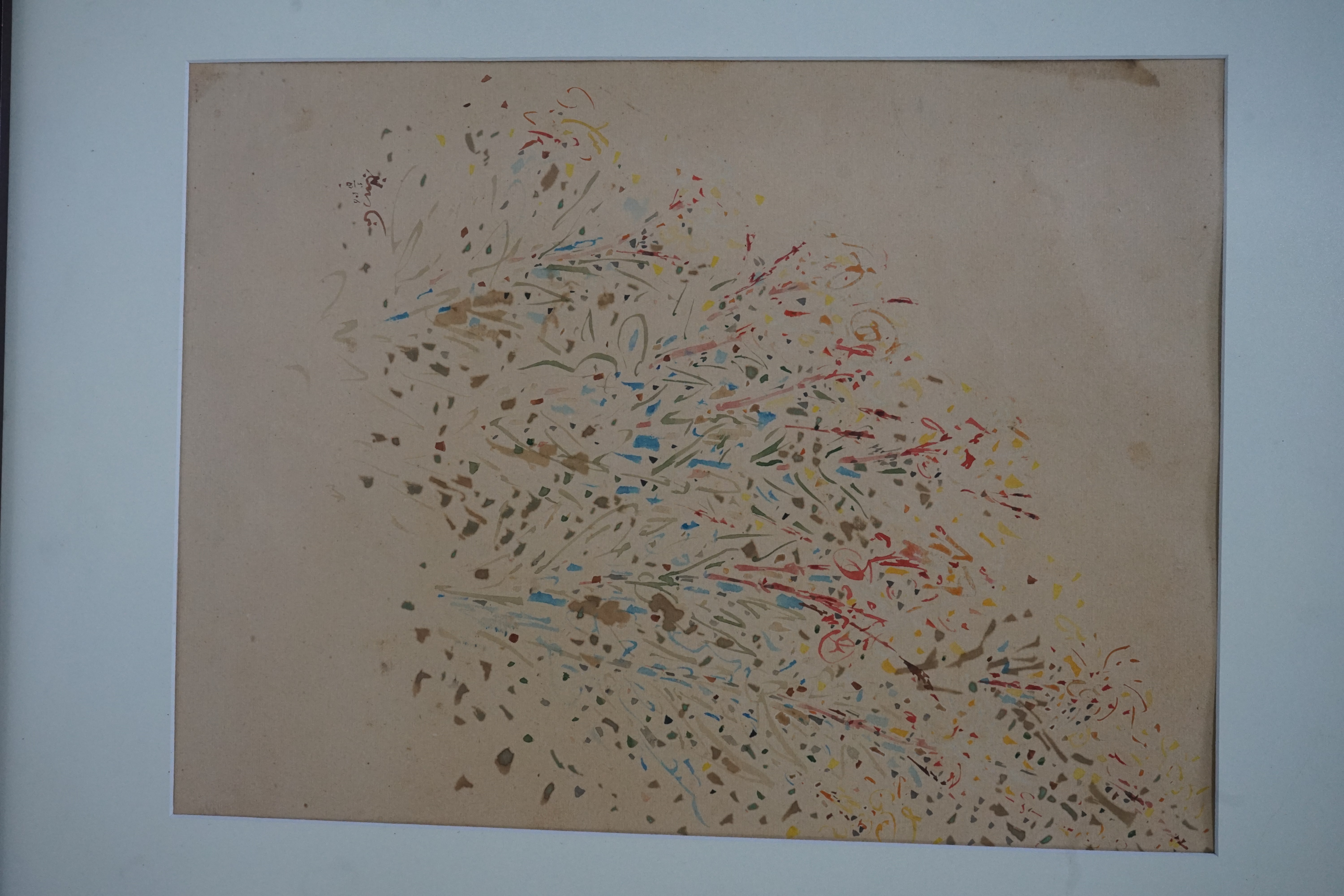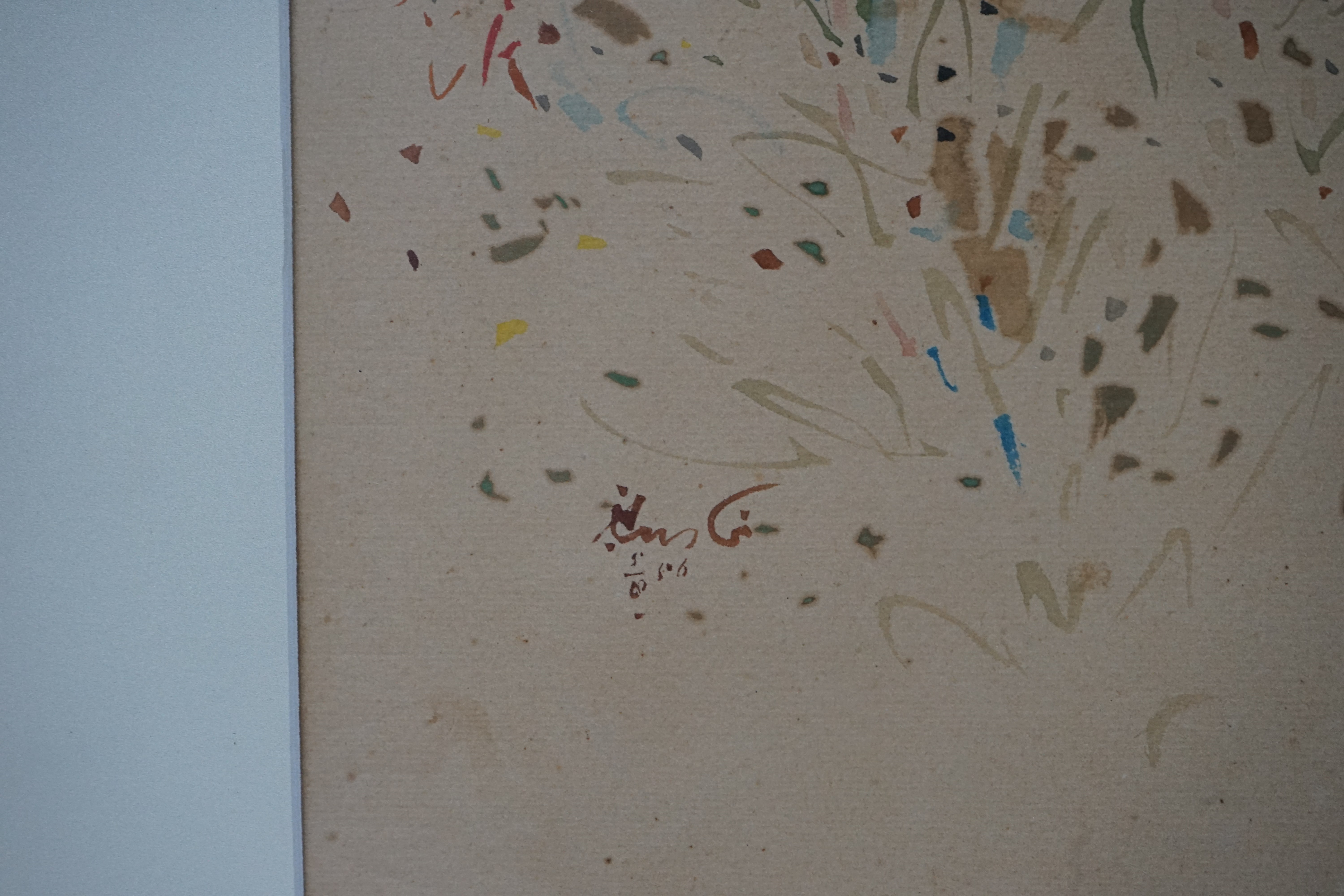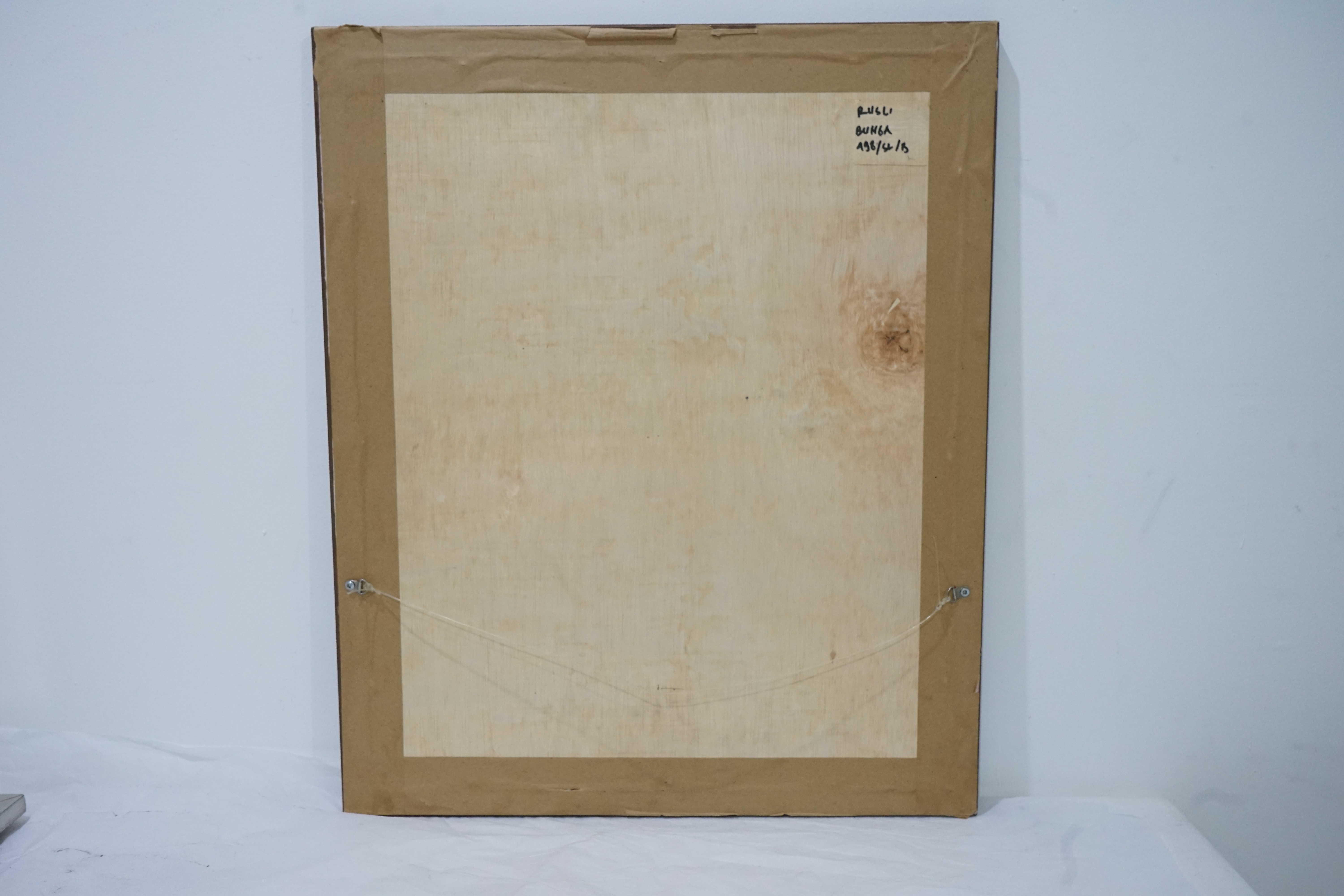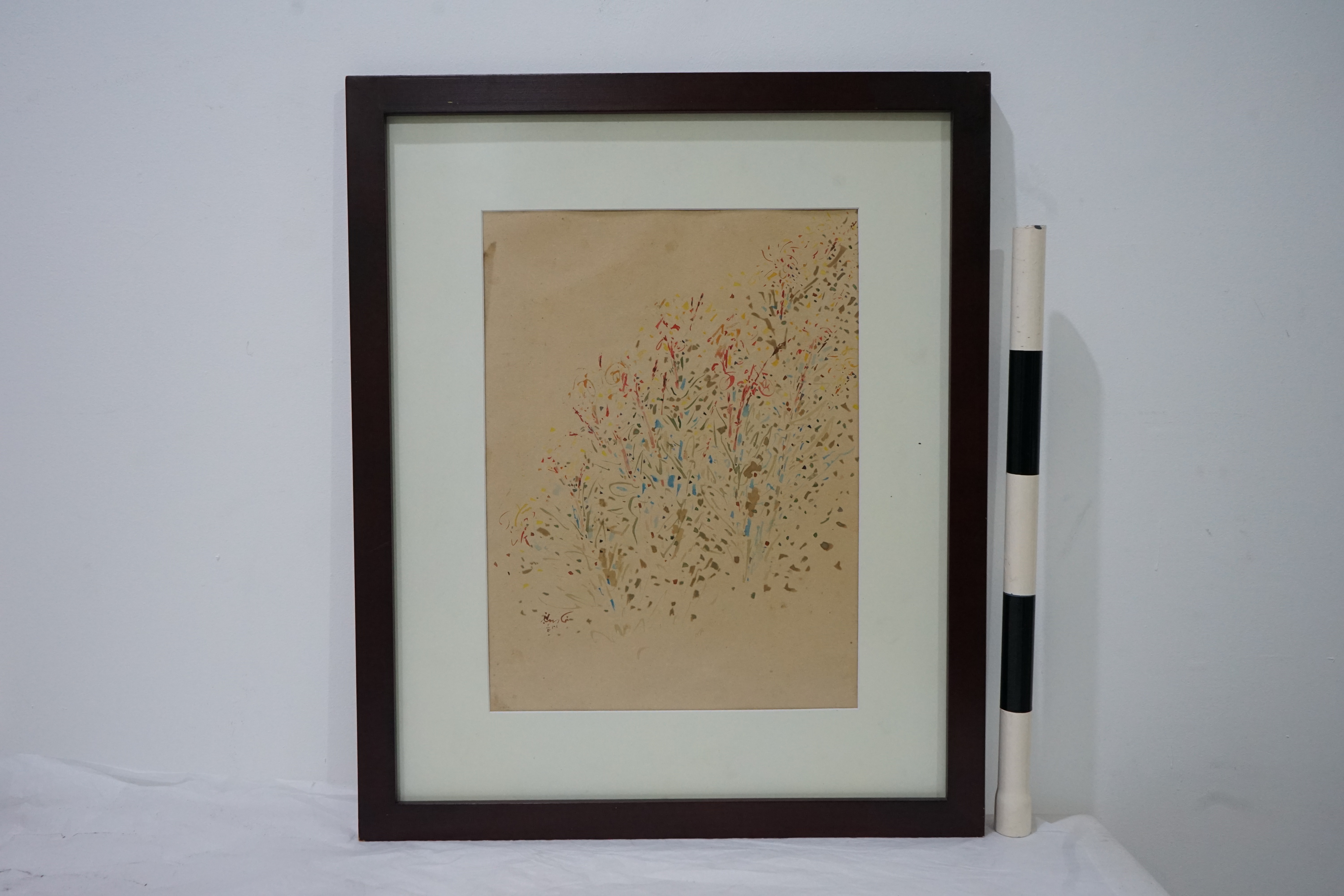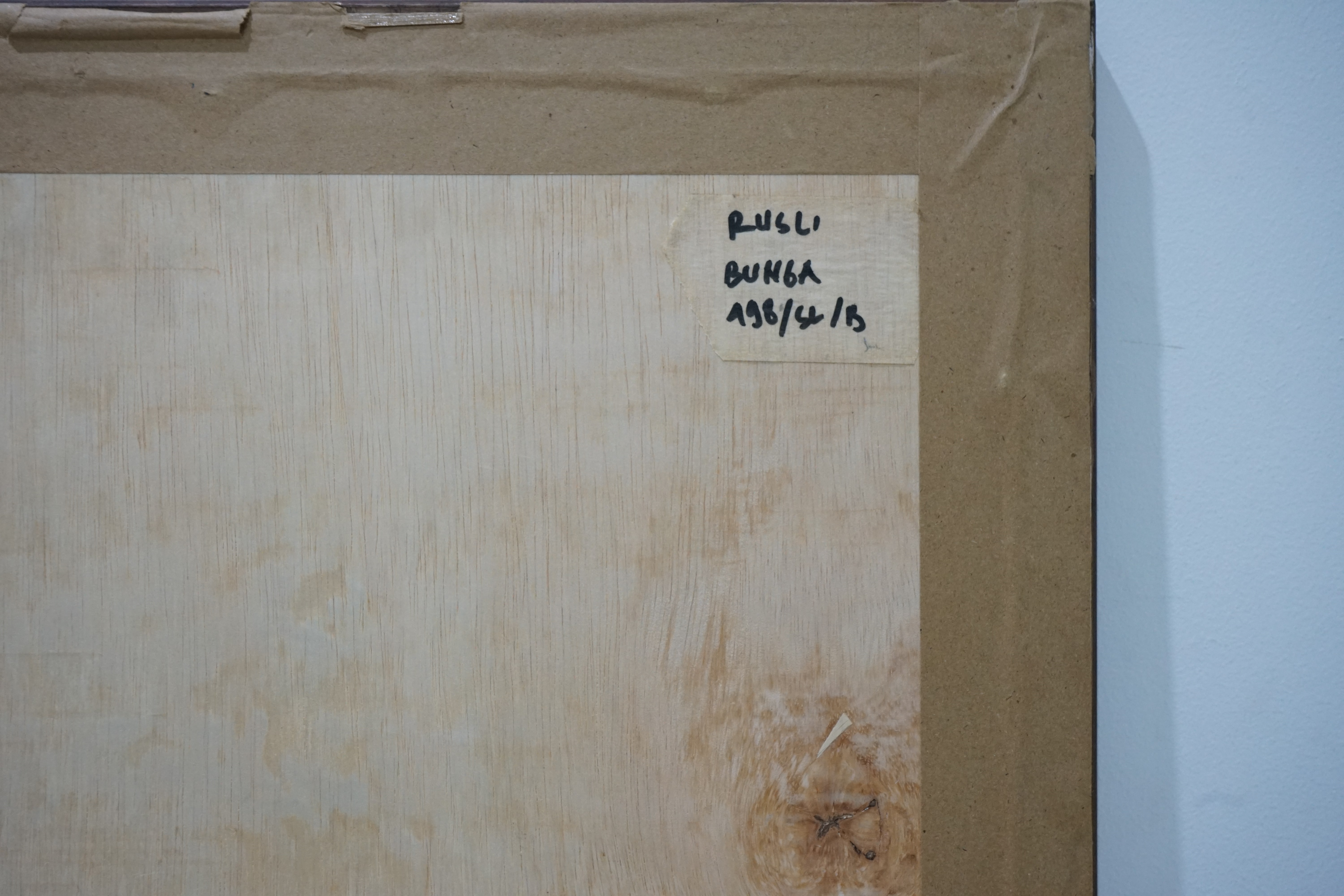 Rusli Bunga Cat air pada kertas 42 cm x 31 cm 1956 Deskripsi: Koleksi ini dilukis di atas kertas persegi panjang yang dibingkai. Lukisan ini menggunakan cat air dan gaya seni abstrak. Dalam lukisan ini abstraksi bunga digambarkan titik dan garis yang memiliki warna beragam. Pada bagian bawah didominasi warna coklat kehijauan yang menggambarkan tanah, warna hijau menggambarkan daun, dan tangkai bunga dilukis dengan warna biru. Sedangkan, abstrkasi pada bunga digambarkan dengan warna merah, kuning, dan jingga. Pada bagian kiri bawah terdapat tulisan tanda tangan penulis. Biodata Seniman: Rusli (1810-2005) lahir di Medan pada tanggal 1 Desember 1810. Ia menempuh pendidikan formal di Kala Bhavana, Visva-Bharati University, Santiniketan, India untuk belajar seni lukis murni, seni patung, dan filsafat seni timur. Rusli kemudian masuk dalam jajaran pelukis senior yang menjadi pembaharu seni lukis di Indonesia. Karya-karya Rusli memiliki garis dan warna yang efektif sehingga tepat fungsinya. Rusli pun lebih banyak menggunakan bidang negatif atau bidang putih kosong untuk mengisi karyanya.