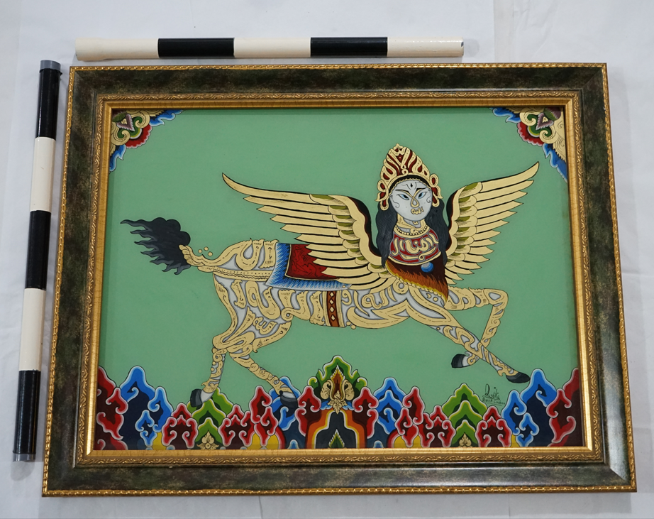 Buraq Rastika Seni Lukis 491/SL/B 60 X 46 cm Lukisan ini merupakan gaya Cirebon dengan berwarna dasar hijau mint. Terdapat gambar buraq di Tengah lukisan dengan warna abu-abu dan dihiasi ukiran huruf Arab berwarna krem. Pada bagian kepala terdapat mahkota dengan warna krem, merah maroon, dan merah cabai. Lukisan ini memiliki rambut yang terurai dengan tekstur rambut yang terlihat berwarna hitam dan abu-abu tua. Rambut ini terurai hingga bagian dada. Terdapat urna berwarna hitam dengan garis. Lengkungan di samping kiri kanan urna nya. Terdapat 2 alis berwarna hitam yang menyambung hingga hidung berwarna krem dan hidung berbentuk huruf Arab “Lam, Alif”. 2 Mata yang menyudut ke atas dengan warna bola mata biru dan hitam-putih. Terdapat mulut yang membentuk tulisan Arab “Allah”. Memakai hiasan badan dan leher hingga dada bawah dengan perpaduan warna krem, merah cabai, biru tua, biru muda, cokelat tua, cokelat muda, dan hijau muda. Wajah buraq ini terlihat seperti wajah manusia. Terdapat 2 sayap yang terbuka lebar berwarna perpaduan krem, hijau daun, cokelat, hitam dengan masing-masing memiliki helaian sayap berjumlah sisi kiri 14 helai dan sisi kanan 13 helai. Pada badan buraq terdapat hiasan hingga bawah berbentuk 4 belah ketupat yang Menyusun dengan warna cokelat tua dan cokelat muda. Memiliki ekor yang pendek dan ujungnya merumbai lebat dengan warna abu tua dan abu muda. Memiliki 4 kaki yang terbuka daan 2 yang bagian depan terangkat. Kaki nya memiliki kuku seperti kuku kuda dengan berwarna abu tua dan abu muda. Secara keseluruhan lukisan ini bertemakan kaligrafi Arab dengan ciri khas terdapat lukisan Arab pada badan buraq seperti “Allah”, “Ya”, “Fa”, “Alif”, “Lam”, “Sin”, “Tsa”, “Wau”, “Ta”, dan “Ja”. Pada bagian bawah buraq terdapat gambar megamendung yang memenuhi dari samping kiri dan kanan dengan beragam warna. Di tengahnya terdapat hiasan berbentuk floral. Di sudut atas kiri dan kanan terdapat sedikit gambar megamendung yang dihiasi bentuk floral dengan bagian tengahnya dengan beragam perpaduan warna merah cabai, merah maroon, hijau tua, hijau muda, biru muda, biru tua, oren, kuning, abu-abu tua dan pink. Lukisan diberi frame nya kayu sebagai pelindung Bentuk fisik Buraq yang ditemui adalah Rasulullah saat hendak melakukan perjalanan Isra' Mi'raj adalah berwarna putih, ukurannya lebih besar dari keledai tetapi lebih kecil dari bighal (hewan persilangan kuda dan keledai), memiliki tali kendali, diberikan lampu di punggungnya, dan dapat berlari sangat kencang, langkahnya sejauh tempat yang ia lihat. Syekh Ahmad bin Muhammad ats-Tsa’labi dalam tafsirnya menukil sebuah hadits dari sahabat Ibnu Abbas mengenai bentuk fisik Buraq yaitu: “Diceritakan dari Ibnu Abbas bahwa Rasulullah bersabda ‘Maka, (Jibril) mengambil tanganku serta mengeluarkanku dari masjid. Ketika itu aku melihat Buraq, pipinya bagaikan pipi manusia, ekornya bagaikan ekor unta dewasa, jambulnya bagaikan jambul kuda, kaki-kakinya bagaikan kaki unta, kuku-kukunya bagaikan kuku sapi, dadanya bagaikan batu permata yaqut, punggungnya bagaikan intan putih, ia dikenakan pelana dari pelana-pelana surga, ia memiliki dua sayap di kedua pahanya, ia berlari bagaikan kilat,’” (Ats-Tsa’labi Ahmad bin Muhammad, al-Kasyaf wal Bayan ‘an Tafsir al-Qur’an [Beirut: Dar Ihya Turats Arab, 2002 M], juz VI, halaman 56).