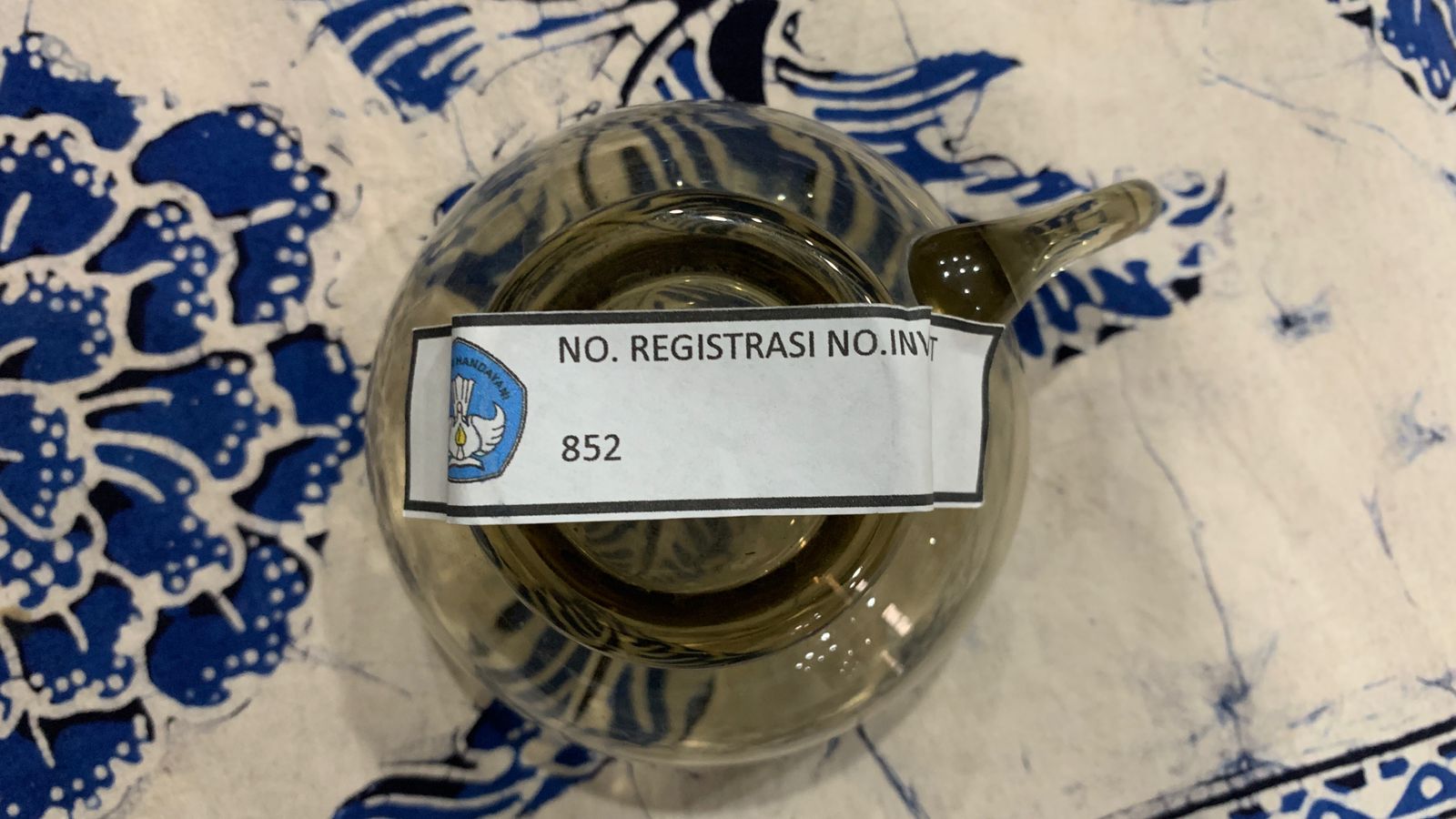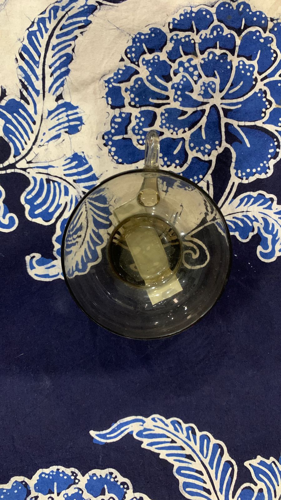 Sebuah cangkir yang pernah digunakan oleh Soetardjo yang terbuat dari bahan kaca, berwarna abu abu, cangkir memiliki pegangan dan memiliki debu.