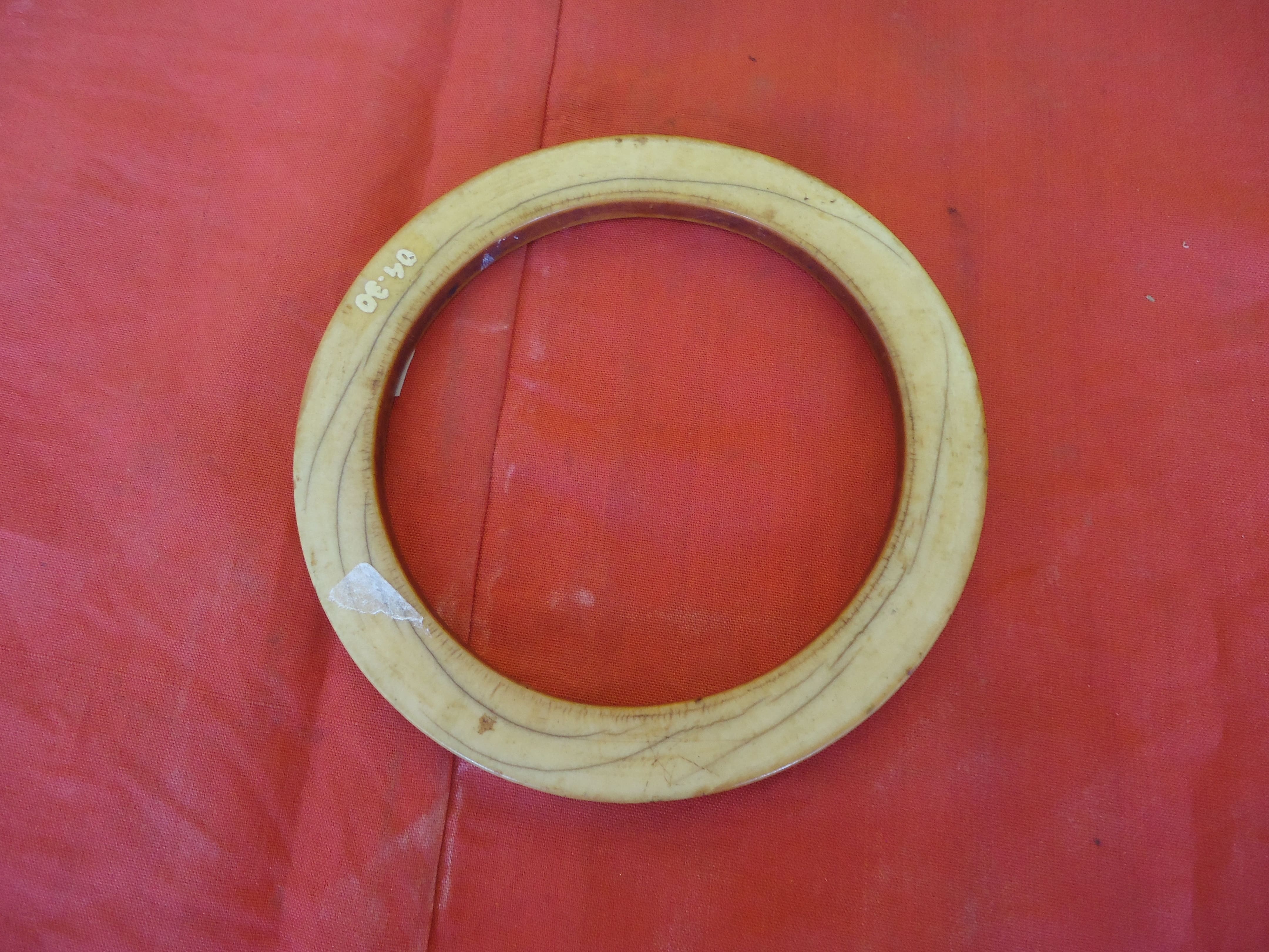 Warma putih, berbentuk kuncup, ada motif bunga, kondisi bagus, ada tulisan Swatow China, bagian bibir atas geripis.