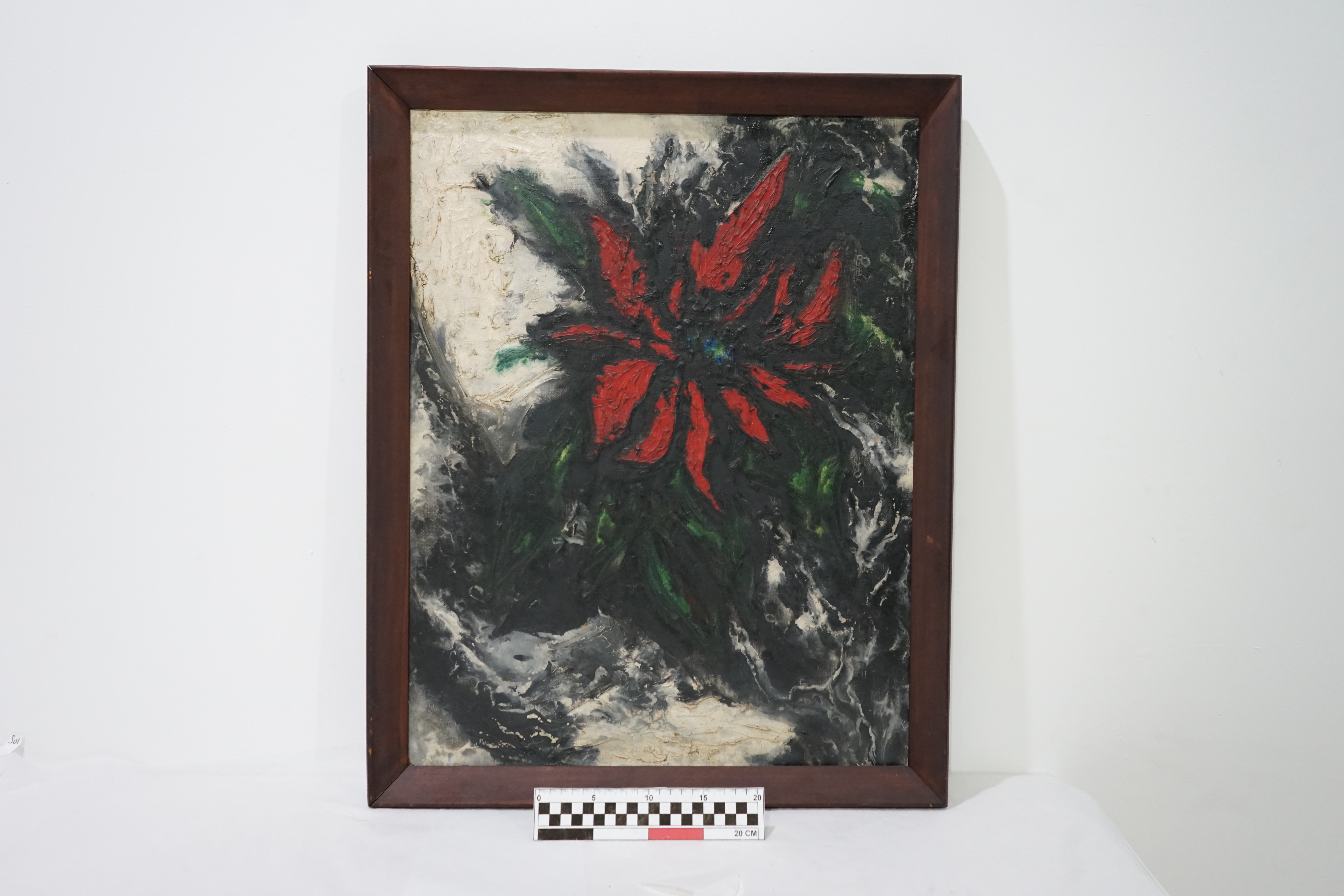 Lukisan ini menggambarkan bunga berwarna merah yang ditumbuhi daun berwarna hijau. Latar belakang karya ini didominasi oleh warna hitam, abu-abu, dan putih.