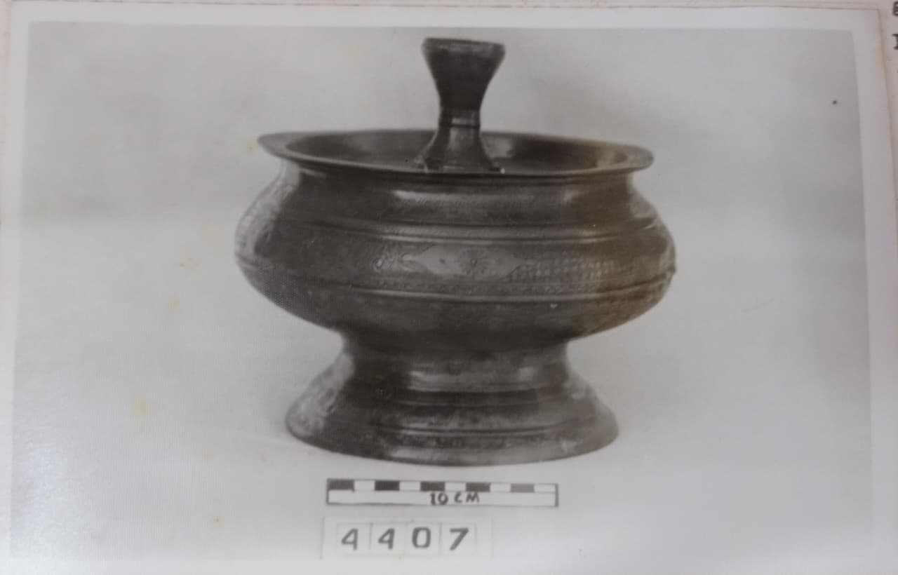 Terbuat dari tanah liat/kaolin, bentuk bulat dan bertutup, glasir warna krem, hiasan motif bunga dan daun. Vietnam, abad 15-16 M.
