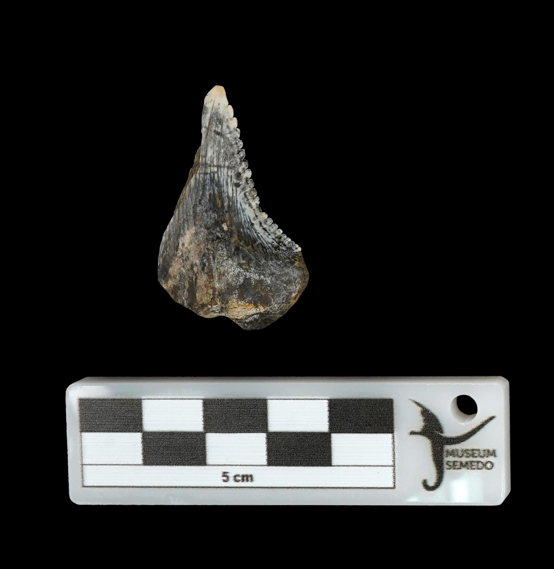 Koleksi merupakan dentary dari hiu Hemipristis sp. Bagian yang terkonservasi adalah akar gigi dan mahkota gigi. Mahkota gigi didominasi oleh warna abu-abu dan hitam dengan kondisi sudah patah sebagian. Terdapat gerigi dibagian samping mahkota gigi serta terdapat indikasi lengkungan (distal notched) yang tipis. Akar gigi berwarna coklat kehitaman dengan kerusakan cukup parah, sebagian besar akar sudah patah dan aus.