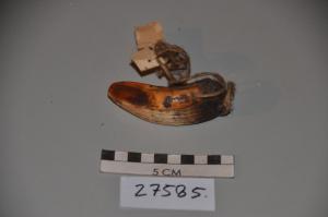Koleksi merupakan dentary dari hiu Hemipristis sp. Bagian yang terkonservasi adalah akar gigi dan mahkota gigi. Mahkota gigi didominasi oleh warna abu-abu kecoklatan dengan enamel gigi pada sisi lingual sudah mengalami pengelupasan. Terdapat gerigi dibagian samping mahkota gigi serta terdapat indikasi lengkungan (distal notched) yang tipis. Akar gigi berwarna coklat kekuningan dengan kerusakan cukup parah, sebagian besar akar sudah patah dan porous.