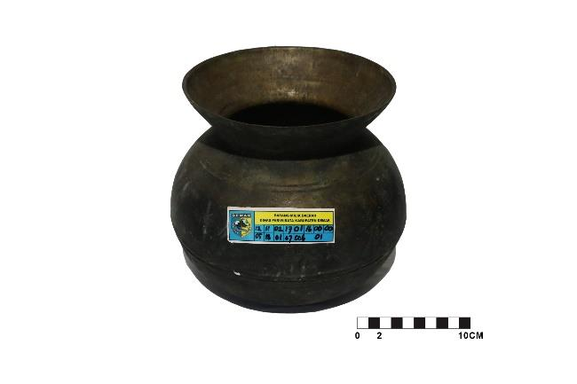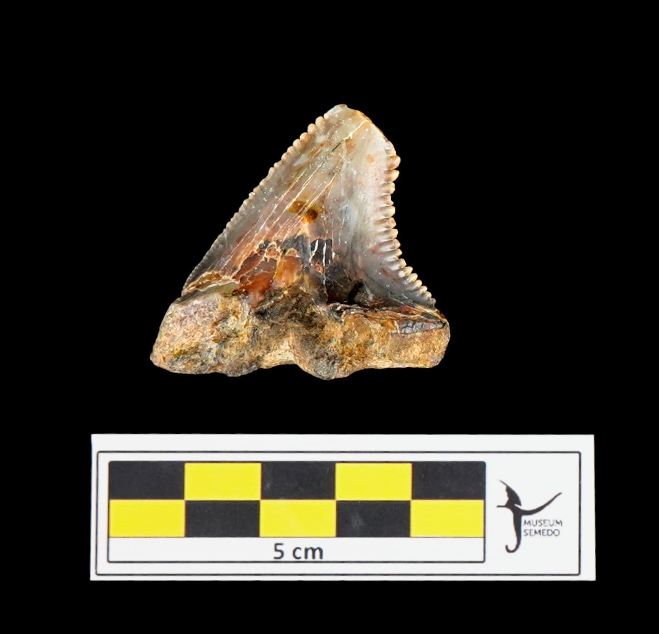Koleksi merupakan gigi dari hiu yang mengkonservasi dari bagian akar gigi (root) sampai pada sebagian dari apex. Secara keseluruhan permukaan koleksi ini didominasi oleh warna coklat kekuningan. Bagian root terlihat cukup lebar. Sebagian enamel terlihat sudah mengalami kerusakan, pada sisi labial kerusakan enamel terlihat pada sekitar root sedangkan pada sisi lingual kerusakan enamel memanjang dari root sampai pada apex. Gigi ini terlihat memiliki lengkungan (distal notched) dengan bagian apex yang sudah patah. Pada pinggir crown terdapat gerigi dengan bentuk dan ukuran yang teratur yakni semakin dekat ke arah apex semakin besar.