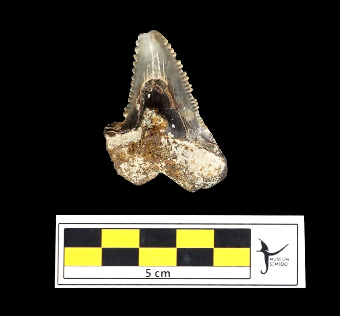 Koleksi merupakan gigi dari hiu yang mengkonservasi bagian akar gigi (root) sampai pada bagian apex. Bagian root didominasi warna coklat kekuningan seangkan bagian mahkota gigi (crown) didominasi warba abu-abu hingga hitam. Gigi ini memiliki lengkungan (distal notched) yang tidak terlalu tajam dengan gerigi pada pinggirnya yang memiliki ukuran dan bentuk yang teratur. Bagian apex terlihat mengalami sedikit patah. Enamel terlihat mengalami pengelupasan pada beberapa bagian, pada sisi labial enamel mengelupas pada area dekat root sedangkan pada sisi lingual enamel mengalami pengelupasan dari area dekat root sampai pada separuh bagian crown. Root mengalami patah sebagian.