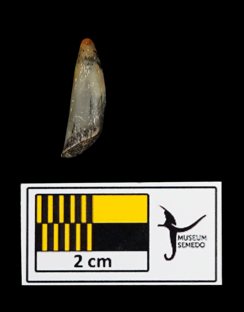 Koleksi merupakan gigi hiu yang mengkonservasi bagian mahkota gigi. Permukaan gigi didominasi oleh warna gradasi warna abu-abu gelap ke abu-abu terang. Bagian ujung mahkota (tip crown) sudah patah dan berwarna jingga. Pada sisi lingual terdapat bagian enamel yang mengelupas. Akar gigi sudah patah sehingga lapisan bagian dalamnya dapat terlihat.