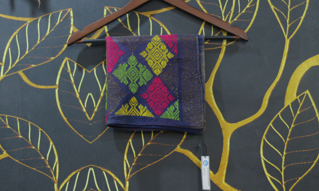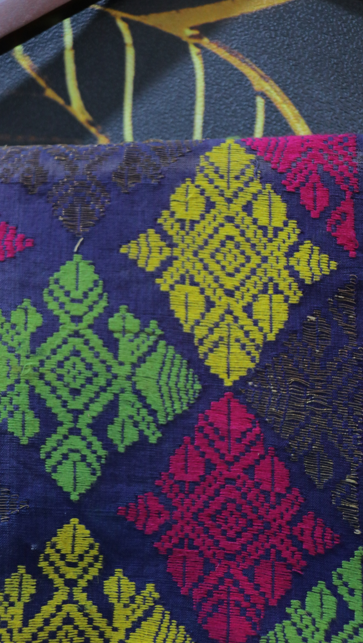 Koleksi ini merupakan sebuah kain berwarna dasar biru dongker dengan motif berwarna perpaduan hijau, kuning, emas, dan merah. Kain ini terdiri dari bagian tengah dan pinggiran. Pada bagian tengah kain terdapat motif berupa pola geometris yang membentuk belah ketupat. Pada kain ini motif belah ketupat memiliki jumlah 40 buah. Adapun motif pada bagian pinggiran berupa pola geometris yanh dijahit dengn benang berwarna emas. Pada sisi lain kain/kain bagian bawah, nampak pola jahita yang lebih jelas yang motifnya membentuk floral (daun dan pohon pinus) sama seperti sisi atasnya. Kondisi : Kondisi kain nampak lusuh di bagian bawah, terdapat jahitan yang mencuat keluar, warna nampak memudar pada bagian sisi bawah, dan terdapat bekas lipatan. Pada bagian sisi atas, terdapat jahitan yang mencuat dan warna pinggirannya nampak memudar.