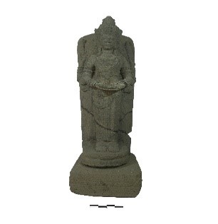 Dewa indra merupakan salah satu dewa tertinggi di dalam mitologi hindu. Dewa indra penguasa langit dan pengendali badai dan awan. Arca ini memiliki empat tangan dengan dua tangan berada di depan diletakan di depan pusar sembari membawa bunga, tangan belakang membawa camara, tangan belakang kiri membawa bajra.