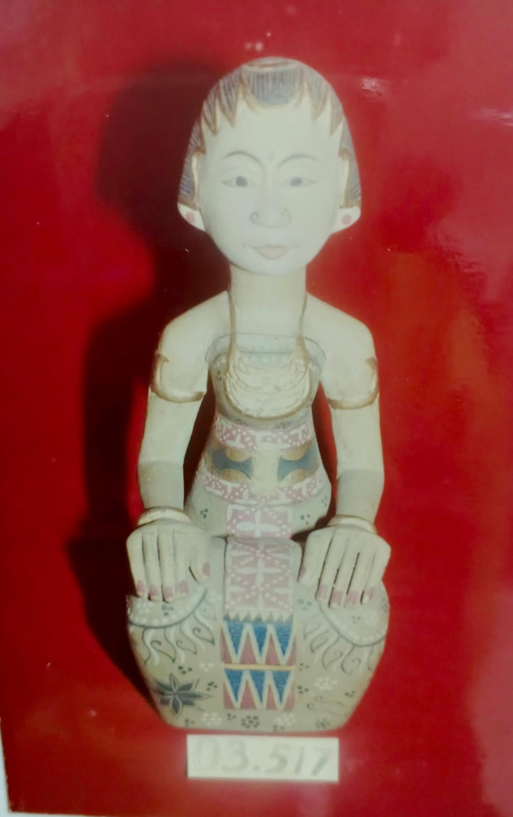 Benda ini terbuat dari bahan dasar kayu, menggambarkan, manusia duduk, warna kuning, putih, hitam, coklat, merah muda, lambang dewi kesuburan. Berfungsi sebagai kelengkapan pasren.