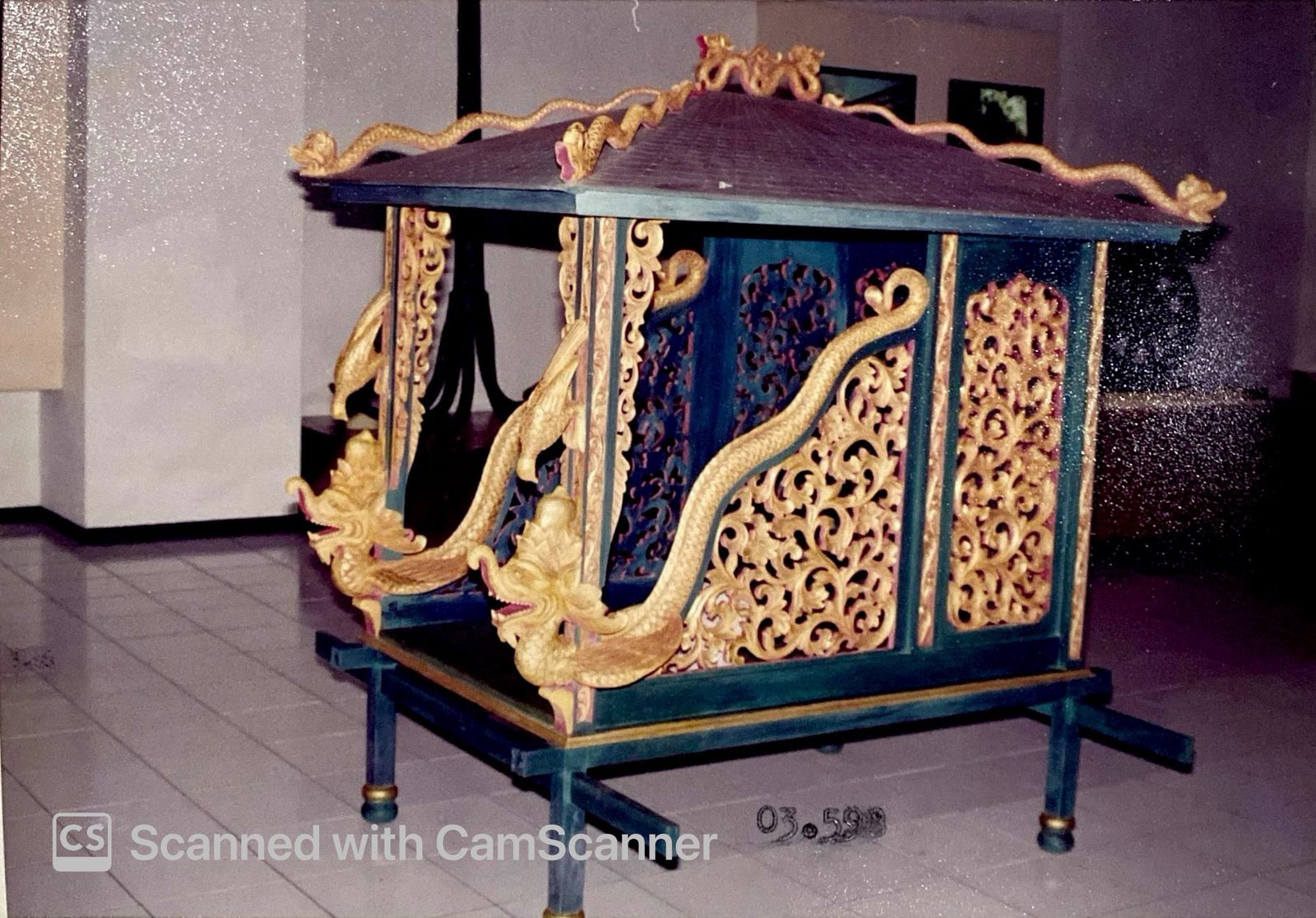 Tandu penganten bentuk nya berupa kotak persegi empat berkaki empat, dimana pada kempat sudutnya terdapat kayu tempat pegangagan para pengusung tandu tersebut. Tandu ini rapat pada tiga sisi, yaitu samping kanan, kiri dan belakang, adapun bagian depan terbuka sebagai pintu masuk penganten yang akan di usung. Hiasan: Pada dinding samping dan belakang diberi motif bunga dan sulur. Pada tiang penyangga bagian depan dihian dengan motif naga bersayap dan Burung pada atap dihiasi dengan motif naga pada keempat sudutnya, serta ditengah dengan dua Naga yang ekornya saling melilit. Warna dominan kuning keemasan dan hijau. Fungsi : Di gunakan untuk membawa penganten Pria saat upacara pangeh dikeraton Surakarta Hadiningrat. Koleksi asli dibuat abad:XIX berada Dikeraton Surakarta.