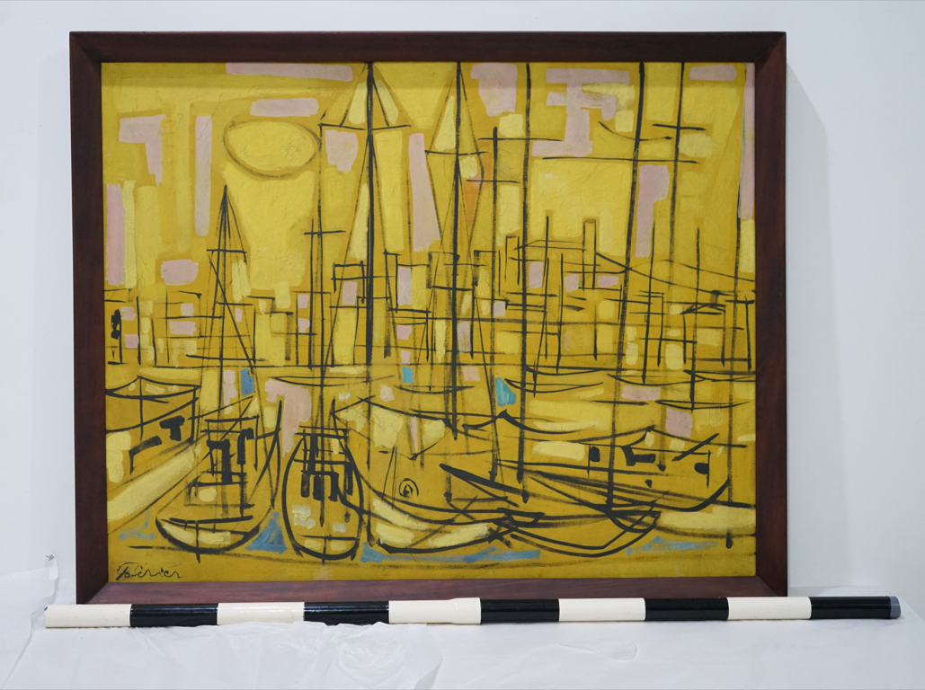 Lukisan ini menampilkan pemandangan pelabuhan yang ramai dengan deretan kapal-kapal yang berlayar. Warna kuning mendominasi latar belakang, sementara siluet kapal-kapal digambarkan dengan garis-garis hitam tebal yang kontras dengan latar belakang tersebut. Tiang-tiang kapal menjulang tinggi ke atas, seolah-olah menyentuh langit. Beberapa bagian kapal dicat dengan warna biru dan putih, memberikan variasi warna pada lukisan. Terdapat pula bentuk oval berwarna putih, yang mungkin menggambarkan matahari atau bulan yang sedang bersinar. Secara keseluruhan, lukisan ini menggambarkan suasana sibuk di pelabuhan.