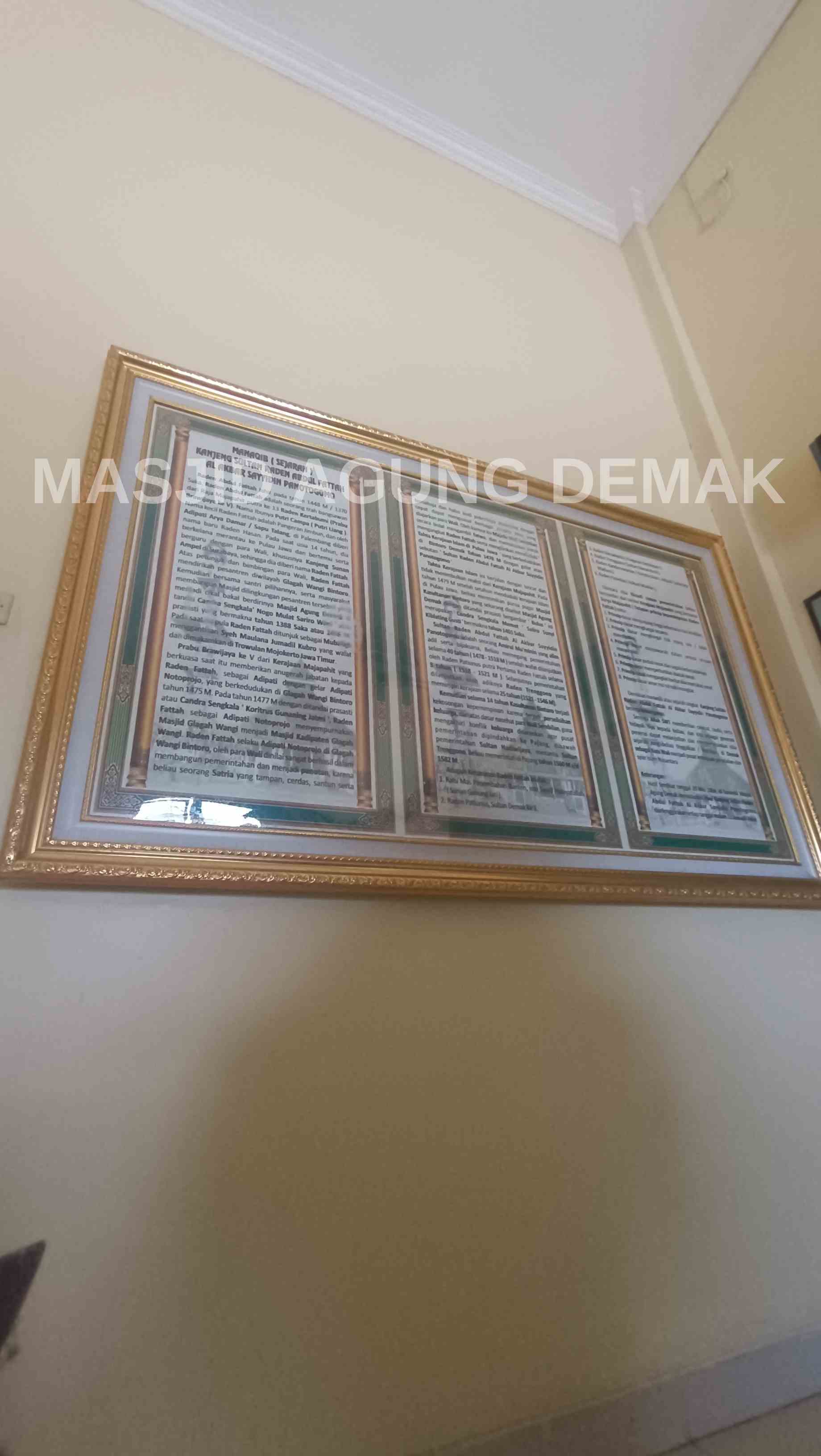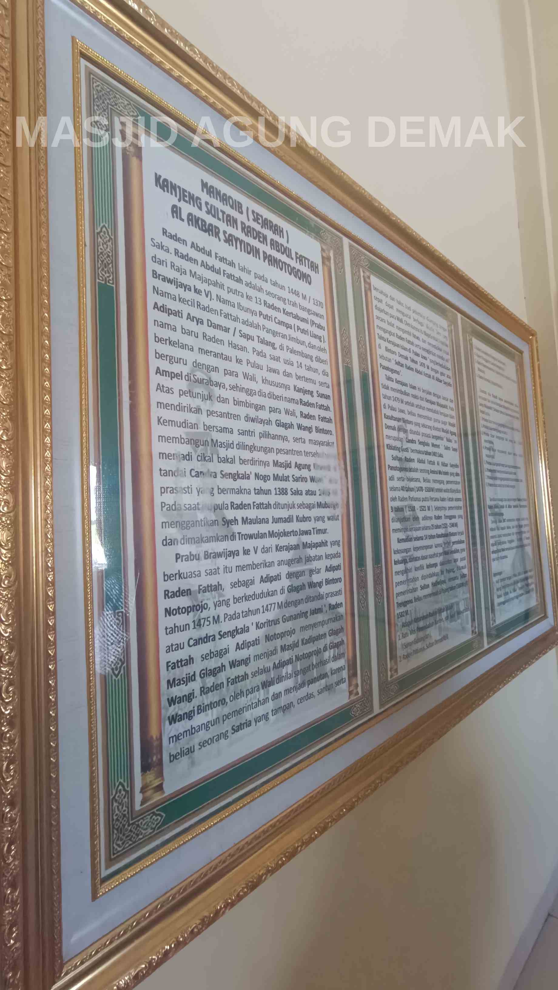 Figura Manakib Raden Fattah list terbuat dari kayu yang berwarna emas dan didalamnya terdapat mmt bertuliskan manakib yang dilindungi dengan kaca bening.