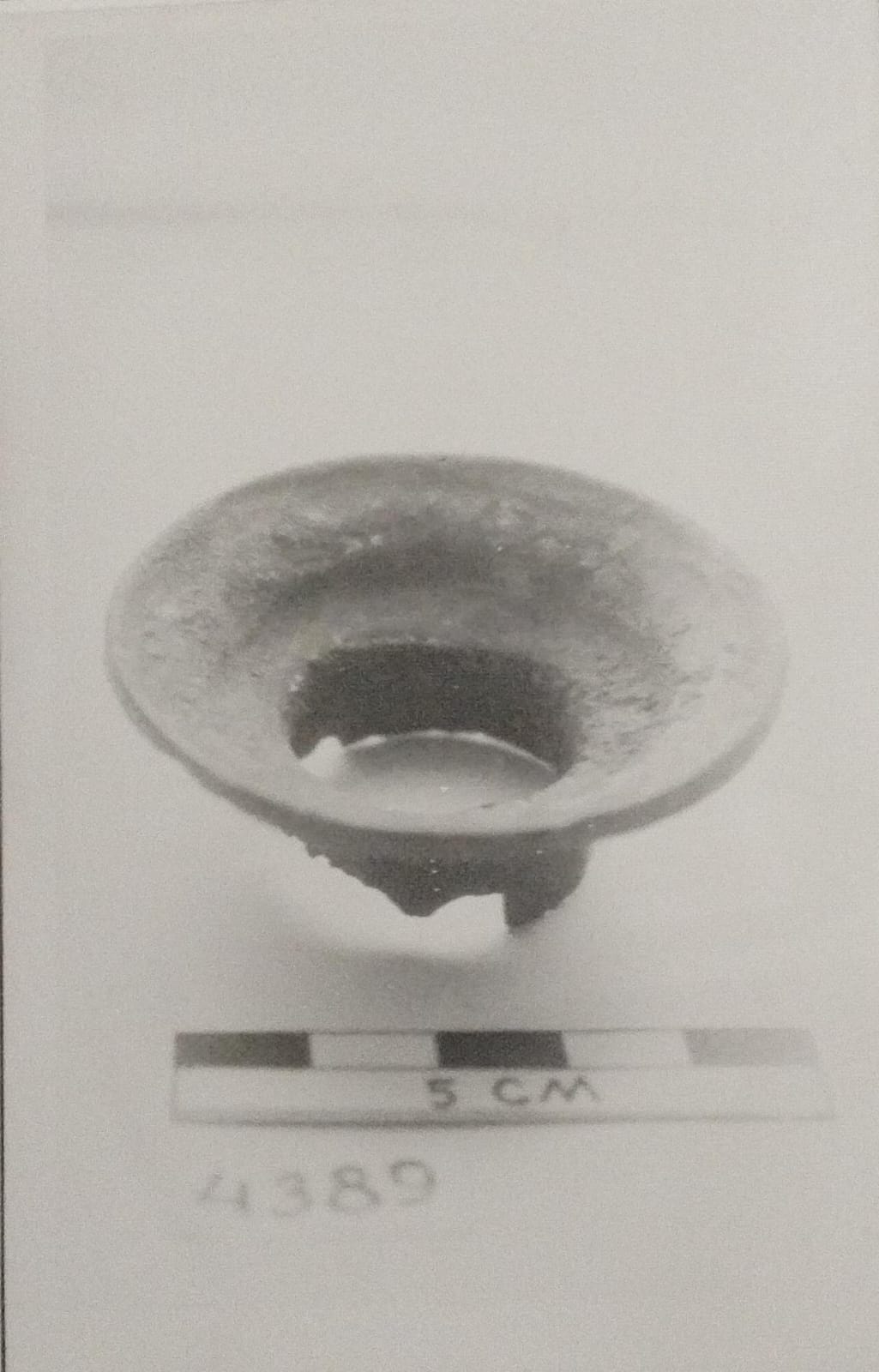 Menggambarkan seorang tokoh wanita berdiri, mempunyai dua tangan. ke atas, Rambut disanggul mengenakan kain panjang hingga sebatas mata kaki Perhiasan yang dikenakan jamang dan subang bulat besar Teknik pembuatan menggunakan cetak hilang dan finishing dengan mengukir, serta pemberian slip warna merah. Dulunya berfungsi sebagai tutup wadah.