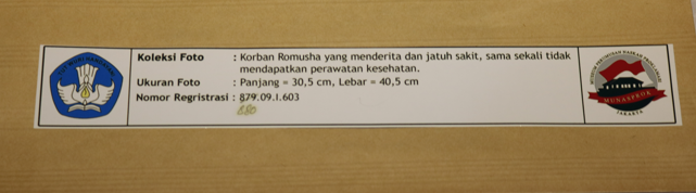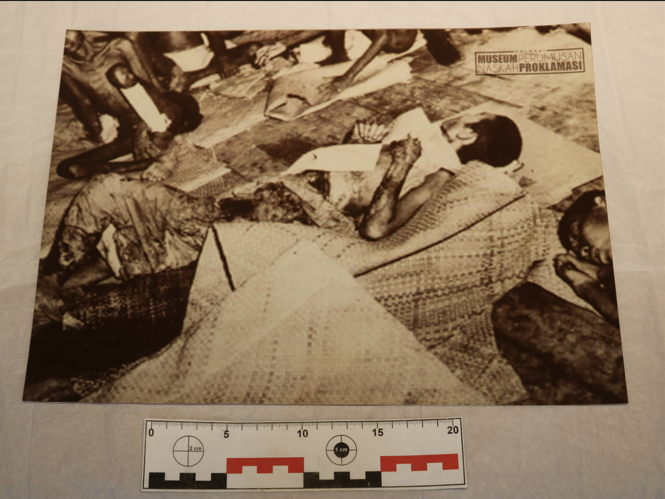 Foto berlatar hitam putih dengan efek sephia. Foto berbentuk lanskap persegi panjang. Foto memuat potret beberapa lelaki dengan tubuh kurus dan terbaring di atas tikar. Beberapa orang di antaranya memiliki kondisi memprihatinkan. Bagian kanan atas foto terdapat stempel koleksi Museum Perumusan Naskah Proklamasi. Sisi belakang foto terdapat label nomor registrasi dan nomor inventaris. Resolusi foto buram.