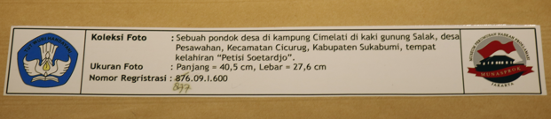 Foto berbentuk persegi panjang dengan orientasi foto portrait. Foto berwarna hitam dan putih. Foto memuat gambar bangunan berupa pondok di Kampung Cimelati, Desa Pesawahan, Kecamatan Cicurug, Kabupaten Sukabumi. Terdapat beberapa pohon di sekitar bangunan tersebut. Bangunan tersebut memiliki beberapa penyangga berwarna putih dan diduga terbuat dari batu. Bangunan tersebut merupakan lokasi kelahiran "Petisi Soetardjo".