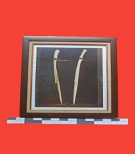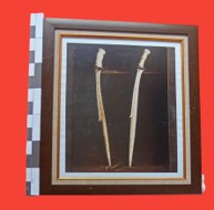 Foto 2 keris berbentuk pedang menghadap kebawah dengan cabang di bagian badan keris. foto menggunakan lis putih,bingkai berwarna kuning keemasan bagian dalam, putih abu bagian tengan dan coklat kehitaman pada bagian luar