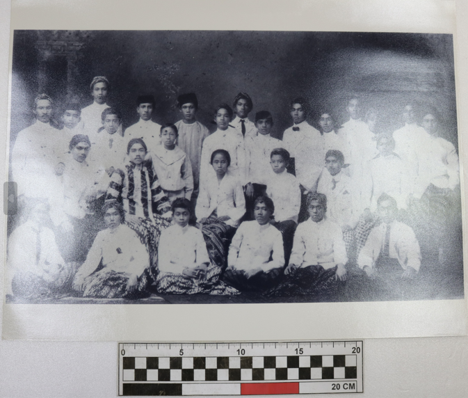 Foto berwarna hitam putih dengan posisi lanskap. Foto menampilkan 27 orang laki laki dan 1 orang perempuan. Foto terdapat Ahmad Soebadjo duduk bersila di depan paling kanan di antara teman temannya. Dalam foto tersebut, mayoritas memakai baju berwarna putih dan bawahan jarik.