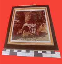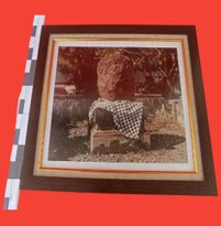 Foto batu yang di tempatkan di atas sebuah tempat berbentuk persegi berisi kain poleng ( kotak-kotak hitam putih pada bagian bawah batu ) foto menggunkan lis putih,bingkai berwarna kuning keemasan bagian dalam, putih abu bagian tengan dan coklat kehitaman pada bagian luar