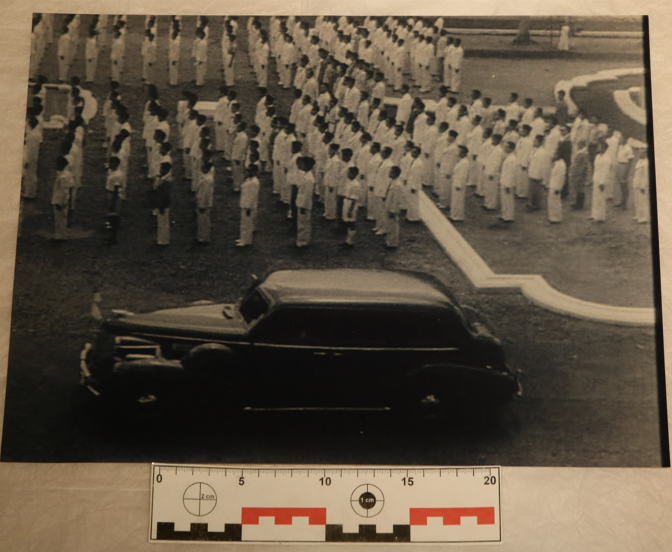 Foto berlatar hitam putih dengan bentuk lanskap persegi panjang. Foto memuat potret barisan sekumpulan orang yang mengenakan setelan berwarna putih. Dalam foto juga terdapat mobil berwarna hitam di bagian sebelah kiri. Sisi belakang foto terdapat label NUP 135 dan tulisan angka 3. Resolusi foto buram, meskipun demikian foto dalam kondisi baik dan terawat.