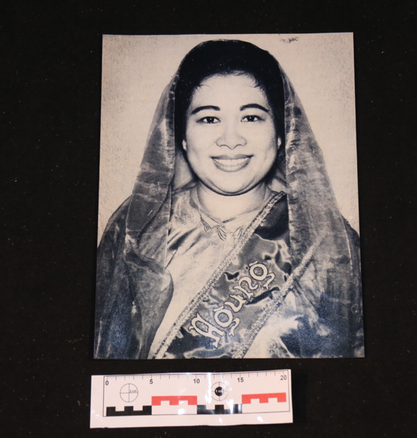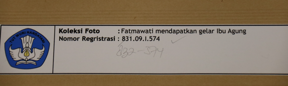Koleksi merupakan sebuah foto dengan posisi berorientasi vertikal (potrait) dan berwarna perpaduan hitam dan putih. Secara keseluruhan foto ini menampilkan potret seorang wanita yang merupakan Ibu Fatmawati. Dalam foto ini beliau tampak mengenakan pakaian wanita, kain selendang yang terbalut di atas kepalanya yang berfungsi seperti kerudung dan hiasan berupa anting dan kalung. Selain itu juga nampak samir/selempang yang bertuliskan "Agung" yang tersampir dari bahu kiri ke bawah. Ekspresi beliau nampak senyum dengan deretan gigi yang ditampakkan serta pada bagian dahi nampak rambut-rambut yang keluar. Kondisi koleksi utuh dan baik.