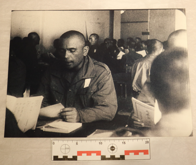 Foto berlatar hitam putih dengan bentuk lanskap persegi panjang. Foto memuat potret sekumpulan pria berambut plontos mengenakan seragam militer sedang duduk membaca buku berbahasa Jepang di dalam ruang kelas. Sisi belakang foto terdapat label NUP 140 dan label nomor 8. Resolusi foto buram, tetapi masih dalam kondisi baik dan terawat.