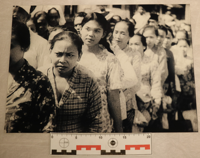 Foto berbentuk persegi panjang dengan orientasi foto lanskap. Foto berwarna hitam dan putih. Foto memuat gambar beberapa orang ibu-ibu sedang berbaris untuk mengatre. Dalam foto tersebut, ibu-ibu mengenakan pakaian bermotif dengan rambut yang diikat. Foto tersebut memiliki latar di salah satu pasar di Jakarta. Sisi belakang kertas foto terdapat label berwarna putih bertuliskan “NUP 145”. Kondisi foto baik dan terawat.