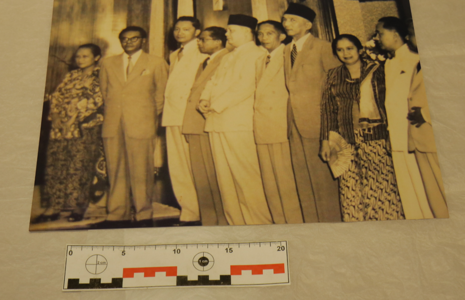 Foto tersebut menunjukkan Mr. Johanes Latuharhary berada diantara tamu undangan lainnya yang terdiri dari beberapa tamu laki-laki dan perempuan. Johanes Latuharhary terlihat menggunakan pakaian formal dengan stelan jas dan dasi. Semua tamu undangan juga menggunakan pakaian formal dan semuanya sedang dalam berdiri tegap. Mr. Johanes Latuharhary berdiri dengan menggenggam tangannya di belakang dan memasang wajah serius. Foto tersebut berbentuk horizontal dengan kondisi yang baik dan utuh. Selain itu resolusi dari foto tersebut terlihat baik dan jelas.