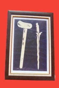 Foto keris luk 11 dengan ukiran pada pegangan dan saruk batun poh foto menggunakan lis putih,bingkai berwarna kuning keemasan bagian dalam, putih abu bagian tengan dan coklat kehitaman pada bagian luar