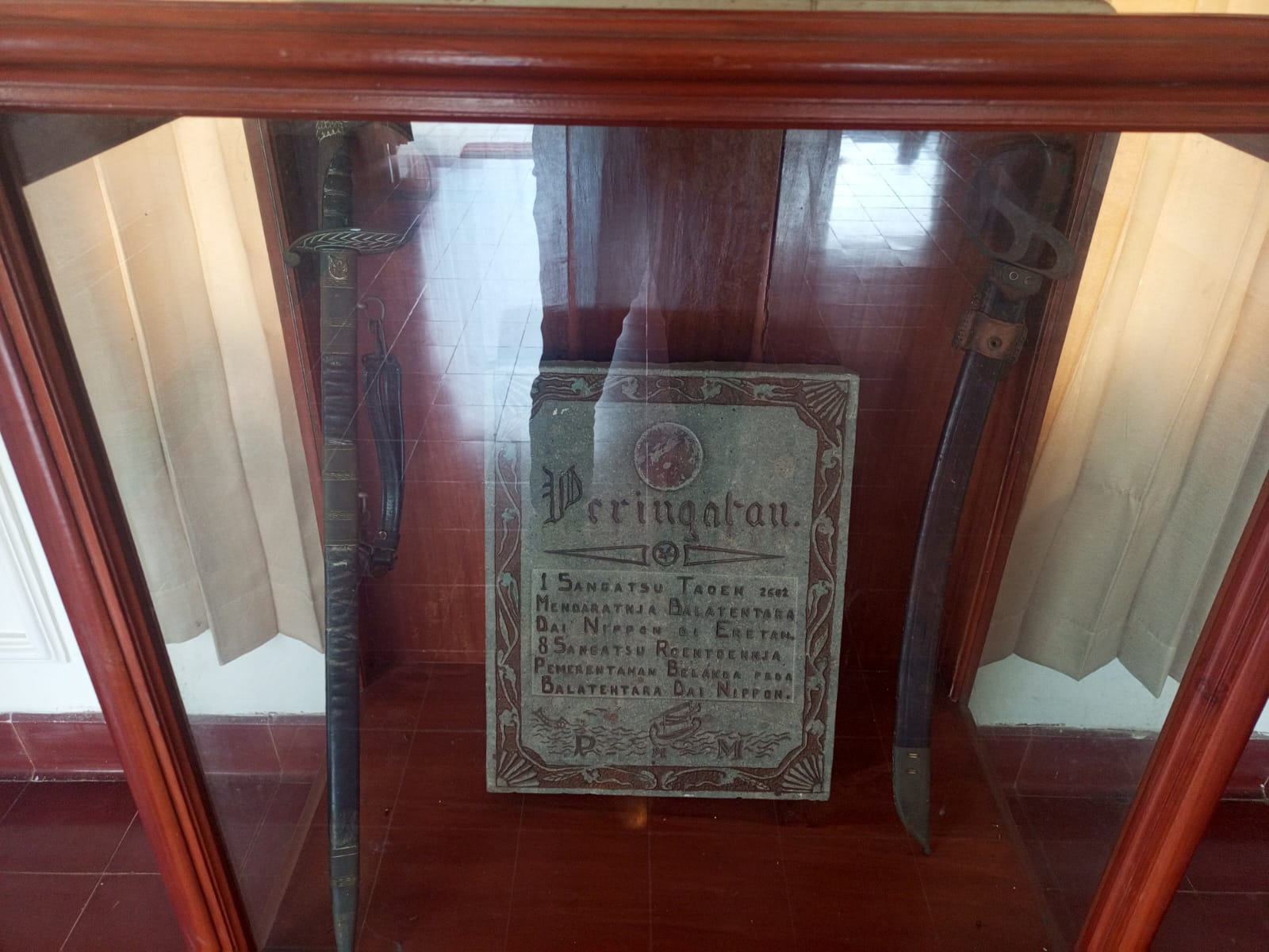 Foto berwarna hitam putih dengan posisi lanskap. Foto menampilkan tiga anggota PETA sedang latihan militer pada tahun 1944. Tiga anggota PETA melakukan pemantauan terhadap pesawat dengan menggunakan alat flightradar. Kondisi foto utuh dan terawat, tetapi resolusi foto buram.