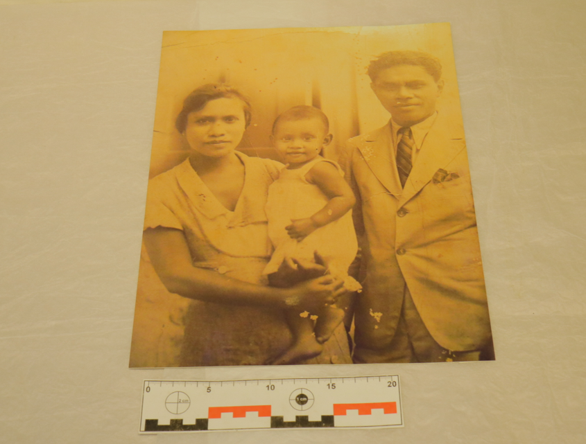 Koleksi merupakan sebuah foto sepia berbentuk persegi panjang dengan posisi portrait. Foto mengabadikan momen foto Johannes Latuharhary bersama istrinya, Henriette Caroline Pattirajawane, beserta anak mereka. Di bagian kiri foto terlihat Henriette berdiri mengenakan pakaian berlengan pendek sembari menggendong anaknya di samping. Anak tersebut mengenakan gaun tanpa lengan dan tersenyum ke arah kamera. Di bagian kanan, tepatnya di samping Henriette, Johannes Latuharhary berdiri dan tersenyum tipis ke arah kamera. Ia mengenakan kemeja berdasi yang dibalut dengan jas. Kondisi koleksi utuh dan baik. Hanya saja kualitas foto kurang begitu jelas, serta terdapat bercak putih dan kuning pada beberapa bagian foto. Pada bagian belakang foto terdapat label tulisan "592.09.1.373" yang ditulis dengan pulpen, serta label cetakan komputer bertuliskan "NUP 36".