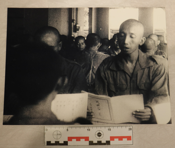 Foto berbentuk persegi panjang dengan orientasi foto lanskap. Foto berwarna hitam dan putih. Foto memuat beberapa anggota HEIHO setelah menjalani latihan di barak pada tahun 1944. Dalam foto tersebut terlihat anggota HEIHO mengenakan seragam militer dan memegang buku. Terdapat label putih bertuliskan "12" dan "NUP 144" di sisi belakang kertas foto. Kondisi foto baik dan terawat.