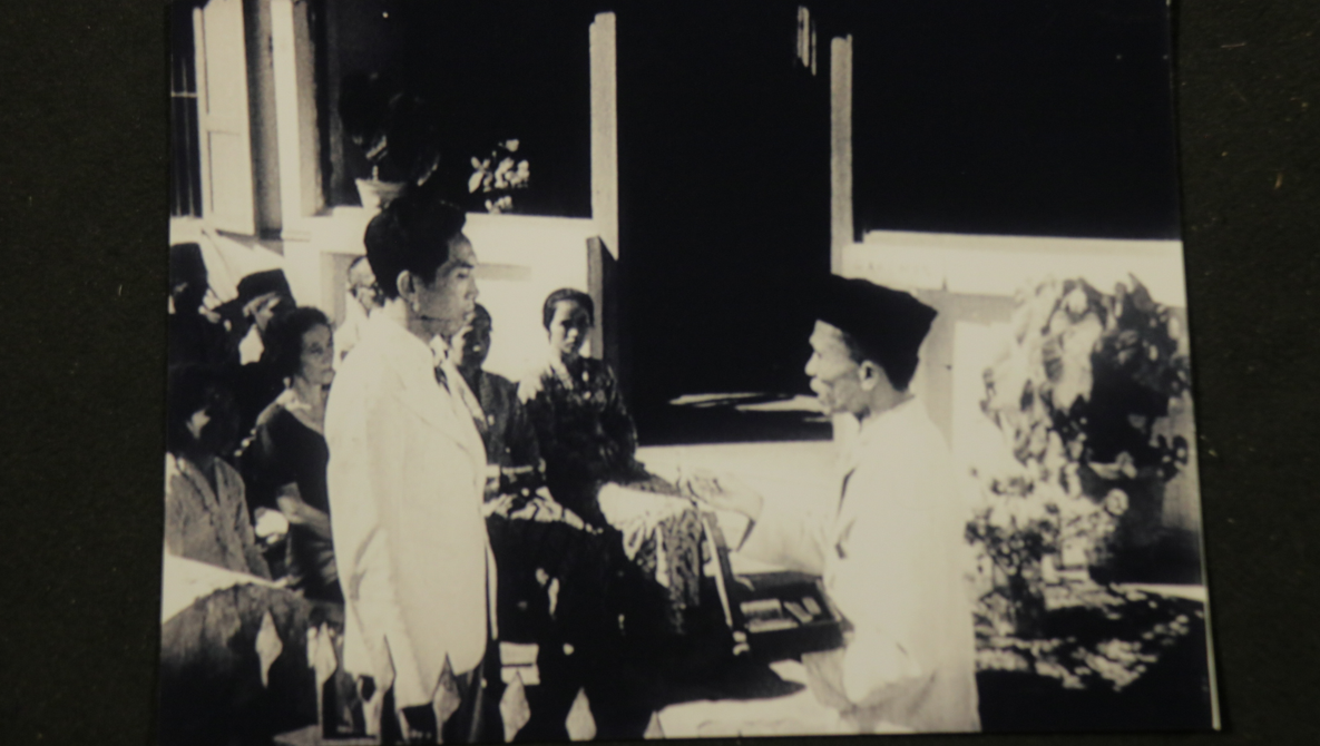Pada foto tersebut terlihat warga yang sedang duduk berbaris di depan teras rumah. Warga yang duduk tersebut memperhatikan kedepan yang dimana terdapat dua orang saling berbicara berhadap-hadapan. Satu menggunakan pakaian formal jas dan terlihat lebih muda, sedangkan yang satu lagi menggunakan baju semi formal dengan peci serta membawa koper yang terbuka. Koper tersebut di dalam nya terdapat beberapa barang, tetapi tidak terlihat begitu jelas. Kondisi : Foto ini berkuran horizontal dengan kondisi yang baik dan utuh. Selain itu resolusi dari foto ini bisa dikatakan baik dan tidak terlalu buruk.