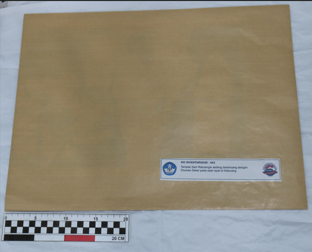 Foto berwarna hitam putih menampilkan 5 orang sedang berbincang di sebuah ruangan. Dalam foto tersebut tampak Sam Ratulangi berbincang dengan Douwes Dekker.