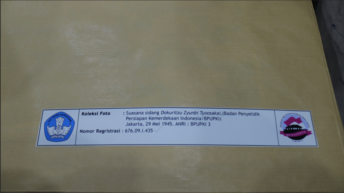 Dalam foto ini, para peserta sidang terlihat mengenakan kemeja berwarna putih. Beberapa di antara mereka mengenakan jas dan peci. Sekitar ruangan dipenuhi dengan meja (dengan nomor di atasnya) dan kursi untuk para peserta sidang. Pada bagian bawah foto terdapat keterangan yang bertuliskan “Suasana sidang Dokoritzu Zyunbi Tyoosakai, (Badan Penyelidik Persiapan Kemerdekaan Indonesia/BPUPKI) Jakarta, 29 Mei 1945”. Di bawahnya terdapat tulisan berwarna merah yang berbunyi “ANRI: BPUPKI 3”. Kondisi Koleksi: Koleksi terlihat dalam kondisi yang baik.
