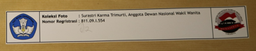 Foto berbentuk persegi panjang dengan orientasi foto lanskap. Foto berwarna hitam dan putih. Foto memuat satu orang tokoh perempuan bernama Surastri Karma Trimurti selaku Anggota Dewan Nasional Wakil Wanita. Tokoh tersebut mengenakan pakaian kebaya yang bermotif dan mengenakan anting. Foto berlatar dinding bergaris-garis. Sisi belakang kertas foto terdapat label putih bertuliskan "5" di bagian kanan atas, stempel ANRI berwarna biru di tengah, dan "NUP 217" di bagian kanan bawah.