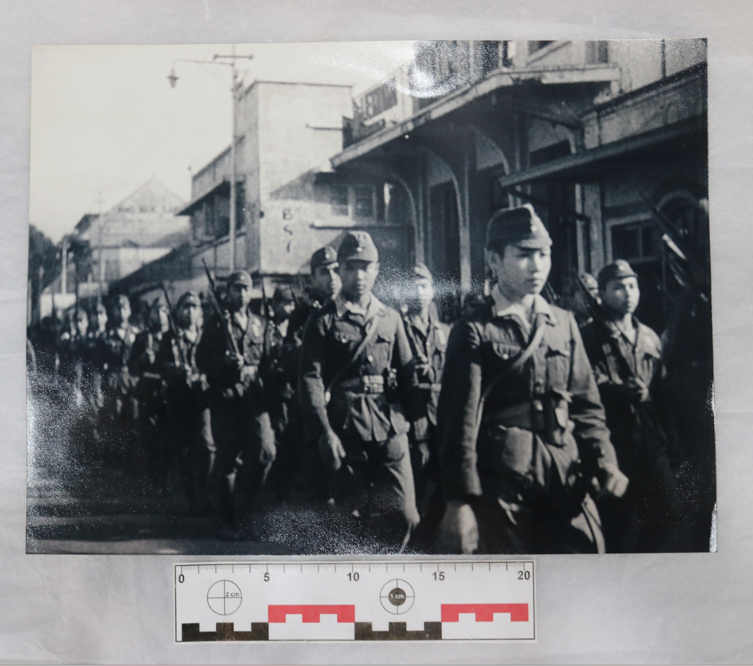 Foto berbentuk lanskap persegi panjang berwarna hitam dan putih. Foto memuat gambar beberapa pasukan anggota tentara PETA sedang berjalan dengan berlatar tempat di sebuah desa. Dalam foto tersebut, para pasukan tentara mengenakan seragam militer yang dilengkapi dengan topi dan senjata.