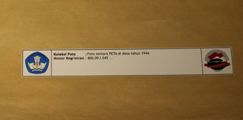 Foto berwarna hitam putih dengan posisi lanskap. Foto menampilkan kedatangan tentara PETA di desa tahun 1944. Para tentara PETA memakai seragam lengkap beserta senjata dan disambut meriah oleh warga desa. Kondisi foto utuh dan terawat dengan resolusi foto buram.