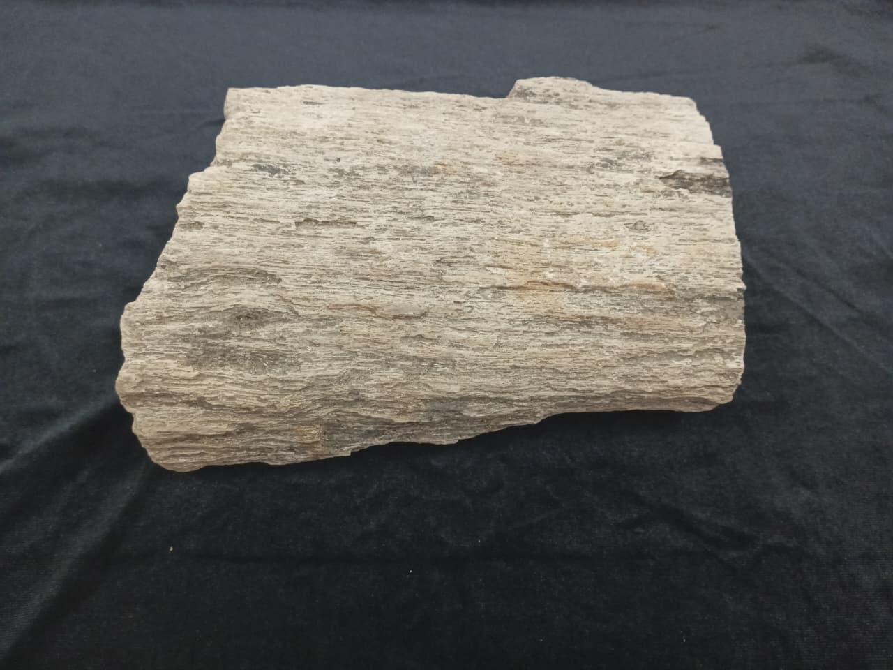 Koleksi ini merupakan fosil batang kayu dari jenis tumbuhan dikotil. Tampak serat-serat kayu pada permukaan koleksi ini. Warna putih keabuan menandakan fosil ini terendapkan pada lingkungan berpasir.