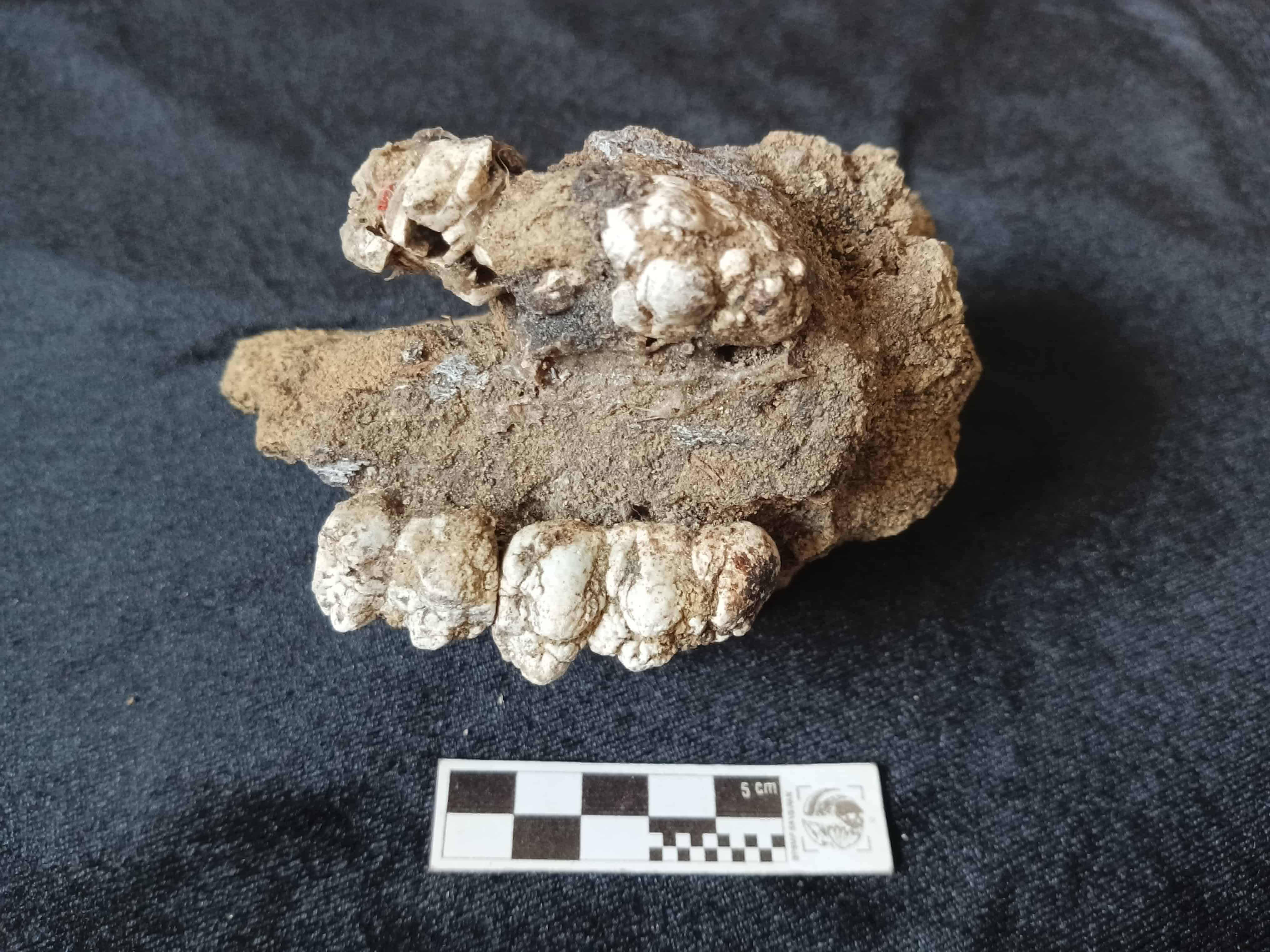 Koleksi ini merupakan rahang atas dari babi purba jenis Sus sp. Koleksi ini tidak utuh, bagian yang masih tersisa adalah bagian maxilla dan terdapat beberapa buah gigi geligi. Bagian maxilla yang bisa diamati adalah tulang maxilla yang cenderung rapuh. Sementara gigi geligi yang tersisa adalah gigi geraham belakang (M), gigi geraham depan (P), dan pecahan caninus atau gigi taring. Gigi molar babi bertipe brachyodont, yaitu molar dengan mahkota yang rendah dan bunodont, yaitu molar yang memiliki tonjolan-tonjolan rendah pada permukaan oklusalnya. Secara umum koleksi ini berwarna putih pucat kecoklatan. Fosil ini ditemukan pada formasi Kabuh dengan lapisan tanah pasir silang siur.