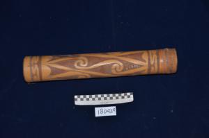 Terbuat dari bahan porselin, berbentuk bundar/tidak utuh, berglasir putih, pada pinggir atas bagian dalam terdapat hiasan garis lingkar, sedangkan pada bagian bawah, kaki pendek dan terdapat stemple. Berfugsi sebagai piring makan. Keadaan benda tidak utuh.