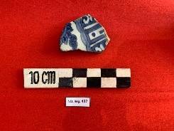 Terbuat dari bahan porselin berbentuk bulat, (pecahan guci/baluhu). Berglasir memiliki ragam hias, bunga, garis lebuh, garis segi empat. Terdapat bulatan garis dan hiasan menyerupai daun pakis. Hiasan tersebut berwarna biru. Berfungsi sebagai pegangan. Keadaan benda tersebut tidak utuh (pecah).