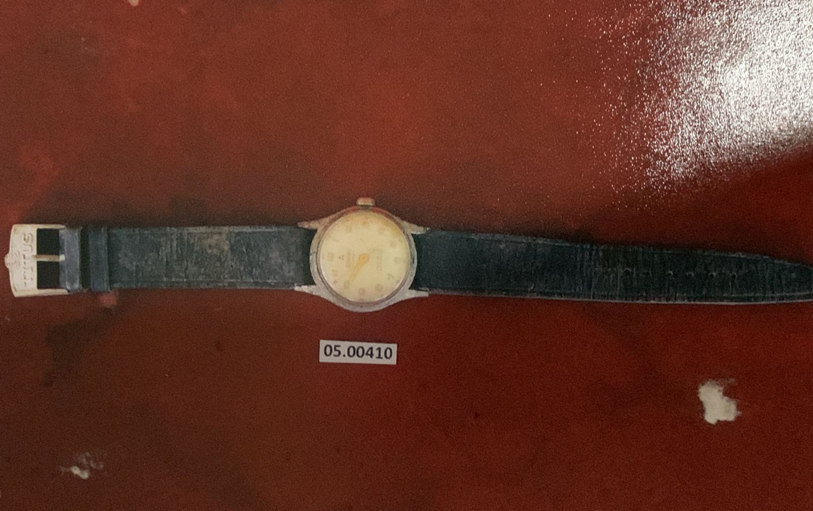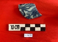 Terbuat dari bahan porselin, berbentuk bundar (pecahan piring) berglasir memiliki ragam hias tangkai bunga, dan garis lingkaran, dan hiasan berbentuk menyerupai hewan ular, hiasan tersebut berwarna biru yang terletak pada bagian luar. Berfungsi sebagai piring makan. Keadaan benda tidak utuh (pecahan)