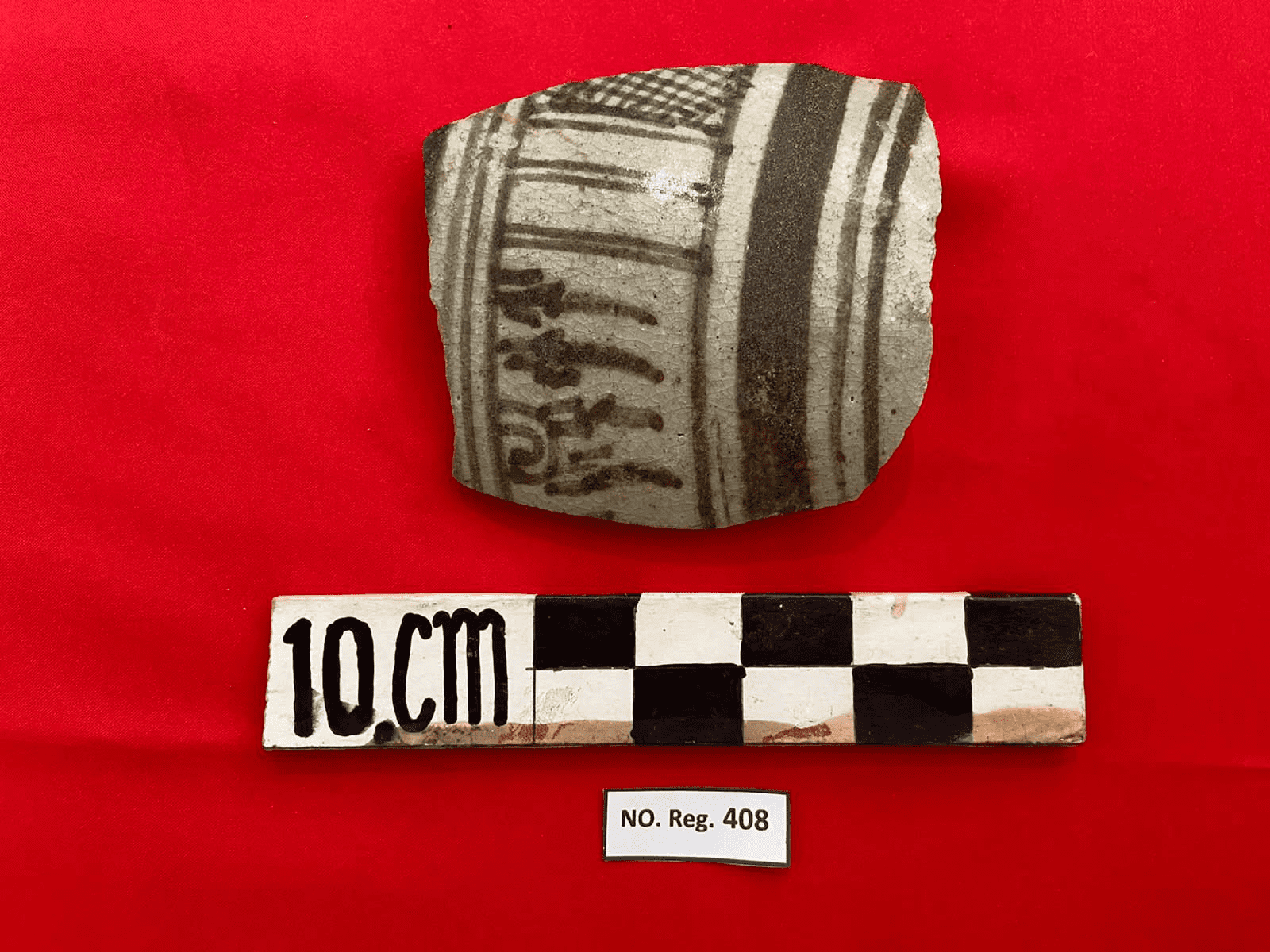 Bahan terbuat dari porselin bergelasir bagian luar terdapat motif garis garis lurus dan melengkung serta motif belah ketupat bagian dalam terdapat garis lengkung. Fragmen ini diperkirakan sebuah tempat tempayan berukuran kecil kepada benda tidak valid.