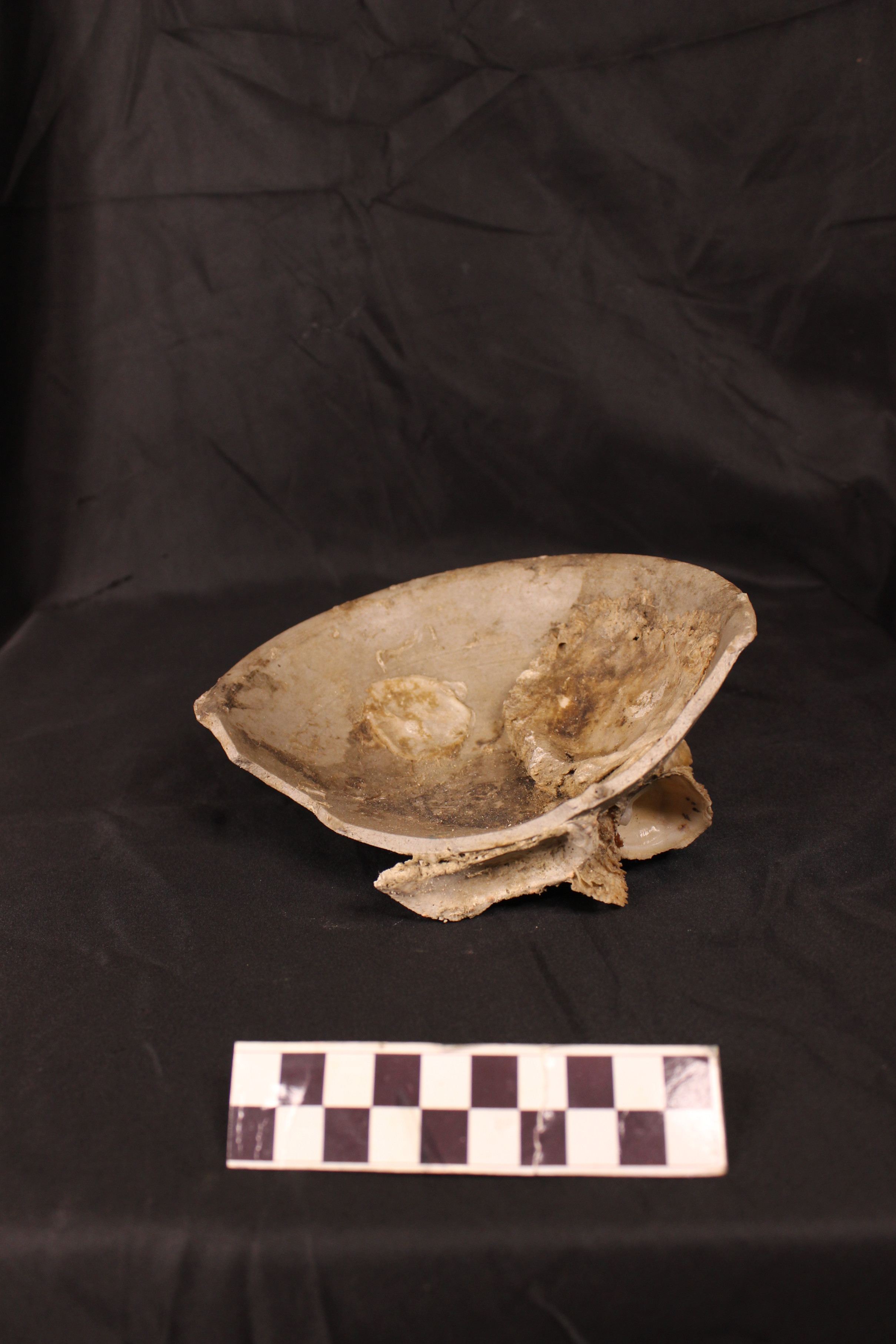Mangkok disamping memiliki fungsi utama sebagai wadah makanan juga dapat berfungsi sebagai hiasan dekoratif ruangan. Secara umum mangkok memiliki mulut lebar dengan badan berbentuk cembung serta bagian dasarnya berbentuk melingkar kecil. Mangkuk ini sudah pecah hampir separuh dan terdapat kerang menempel.
