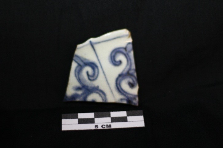 Fragmen mangkuk bagian tepian yang memiliki motif hias berwarna biru. Tepian mangkuk terdapat lekukan sedikit menonjol seperti bentuk akolade (kurawal). Pada permukaan dinding dalam bagian tepian terdapat hiasan berupa garis kurawal mengikuto bentuk tepian dan motif scroll (bulatan melingkar) yang tersusun berjajar secara horizontal mengelilingi tepian. Pada bagian dinding luar mangkuk memiliki hiasan berupa garis kurawal mengikuti pola bentuk tepian dilanjutkan dengan hiasan flora (tanaman suluran) yang dibatasi oleh satu garis vertikal. Koleksi ini merupakan fragmen dari sebuah mangkuk yang diproduksi di Cina pada masa Dinasti Ming