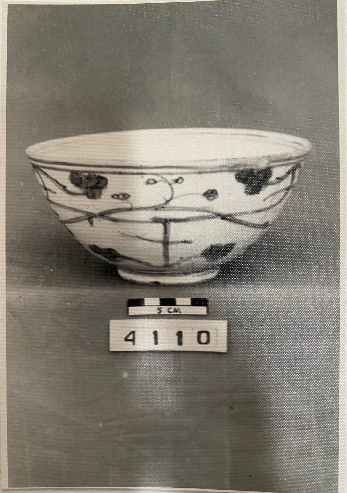 Fragmen piring bagian dasar, pada bagian permukaan dinding dalam terdapat motif hias flora (ranting, daun dan kelopak bunga) dengan teknik pengerjaan berupa garis yang dilapisi atau ditumpuk dengan blok warna biru namun pewarnaan tidak rapi. Terdapat dua garis melingkar mengelilingi motif flora tersebut. Bagian dasar piring sebagian tidak berglasir dan pada lingkar kaki terdapat tempelan pasir. Lingkar kaki pendek dan agak tebal. Potongan ini merupakan bagian dari piring yang diproduksi di Cina pada masa Ming (Swattow) abad 17.