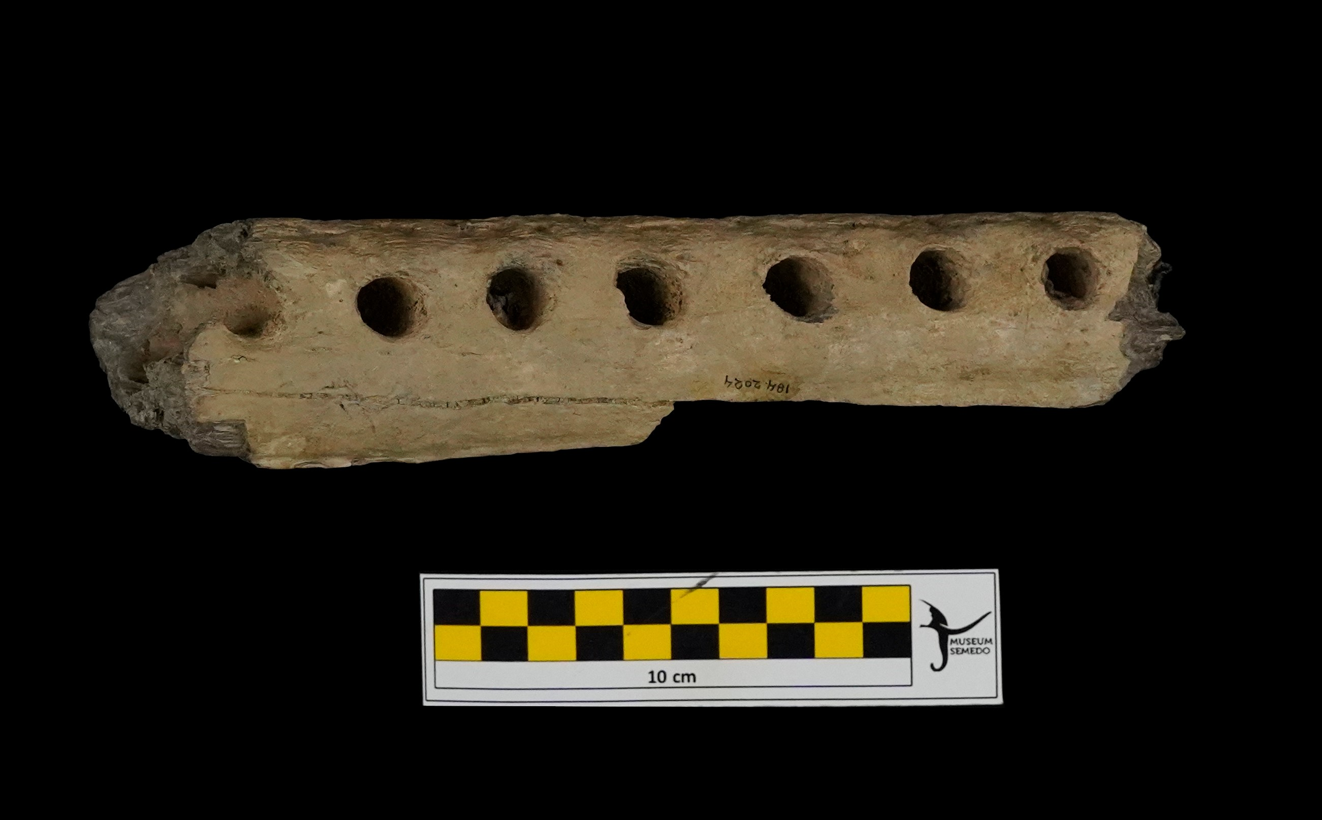 Koleksi merupakan fragmen moncong buaya yang hanya terkonservasi bagian korpus rahang bawah (mandibula). Berwarna coklat keabu-abuan akibat fosilisasi, pada bagian atas masih tampak enam buah lubang membulat yang merupakan bekas gigi. Duah buah jejak akar gigi masih tampak pada lubang-lubang tersebut.