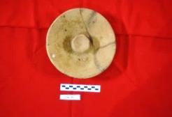 Terbuat dari bahan earthware (tanah liat) berupa fragmen tempayan menyerupai penutup kendi dengan bentuk lingkaran, terdapat pegangan tangan yang tidak utuh berwarna coklat. Temuan ini memiliki tekstur yang kasar dan motif garis lingkaran pada bagian tengah. Berfungsi sebagai penutup.