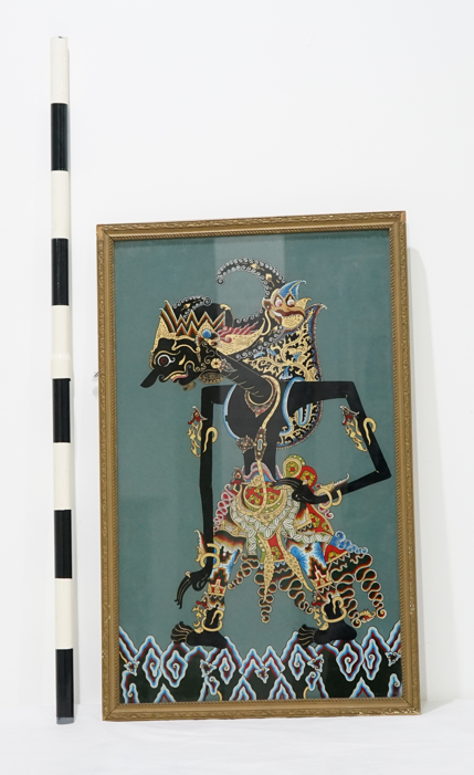 Gatotkaca Anonim Seni Lukis 577/SL/B 68 X 41 cm Lukisan ini memiliki warna dasar berwarna abu-abu. Terdapat satu tokoh pewayangan yaitu Gatotkaca. Pada bagian bawah lukisan terdapat motif Mega Mendung dengan aksen perpaduan warna hijau, kuning, biru, biru muda, merah dan putih. Secara keseluruhan kulit Gatotkaca ini berwarna hitam. Pada bagian kepala Gatotkaca tampak mengenakan hiasan (mahkota) berwarna emas dengan ragam hias geometris dengan aksen warna kuning, putih, merah, hijau yang memiliki motif lainnya yaitu floral. Pada bagian wajah memiliki mata yang berwarna merah, putih, dan hitam. Memiliki hidung yang terlihat panjang, alis berwarna emas, memiliki kumi berwarna emas, telinga terdapat motif floral berwarna emas, merah, biru muda, dan biru tua. Selain itu Gatotkaca ini digambarkan memiliki leher yang panjang. Pada bagian badan tampak mengenakan kalung berwarna merah, merah muda, kuning, dan hijau. Pada bagian lengan menggunakan kelat bahu yang bermotif floral dengan warna emas, merah, dan abu pada kedua lengan kanan dan kiri. Pergelangan tangan mengenakan gelang berwarna emas di kedua sisi menggunakan ali-ali di jari kedua tangannya yang memiliki warna emas dan merah muda. Lalu pada bagian badan tepatnya di bagian dada terdapat ulur-ulur berwarna biru, kuning, dan coklat. Tokoh ini tampak mengenakan praba berwarna hitam, coklat, biru, merah, dan emas dengan motif sulur. Terdapat juga tali di bagian praba terdapat bledegan dengan warna coklat, biru, merah, putih dan abu yang berbentuk menyerupai garuda. Pada bagian bawah terlihat menggunakan sabuk untuk mengikat jarik yang memiliki perpaduan warna merah, biru, dan abu-abu. Pada bagian bawah sabuk terdapat badong dan uncal wastra dengan motif batik kumeli berwarna hijau, abu-abu, kuning, dan merah. Lalu pada bagian bawah uncal wastra terdapat uncal kencana dengan warna emas berjumlah 2 dan terdapat sembulian dengan perpaduan warna kuning, hijau, merah dan putih. Lukisan ini mengenakan celana dengan motif geometris yang berwarna biru, biru muda, kuning, hijau, merah dan putih. Pada bagian bawah celana terdapat gelang suku atau kroncong yang bermotif sulur berwarna emas. Lalu pada bagian kaki terdapat palemahan yang berwarna emas. Lukisan ini memiliki bingkai yang terbuat dari kayu berwarna coklat dihiasi dengan motif sulur.